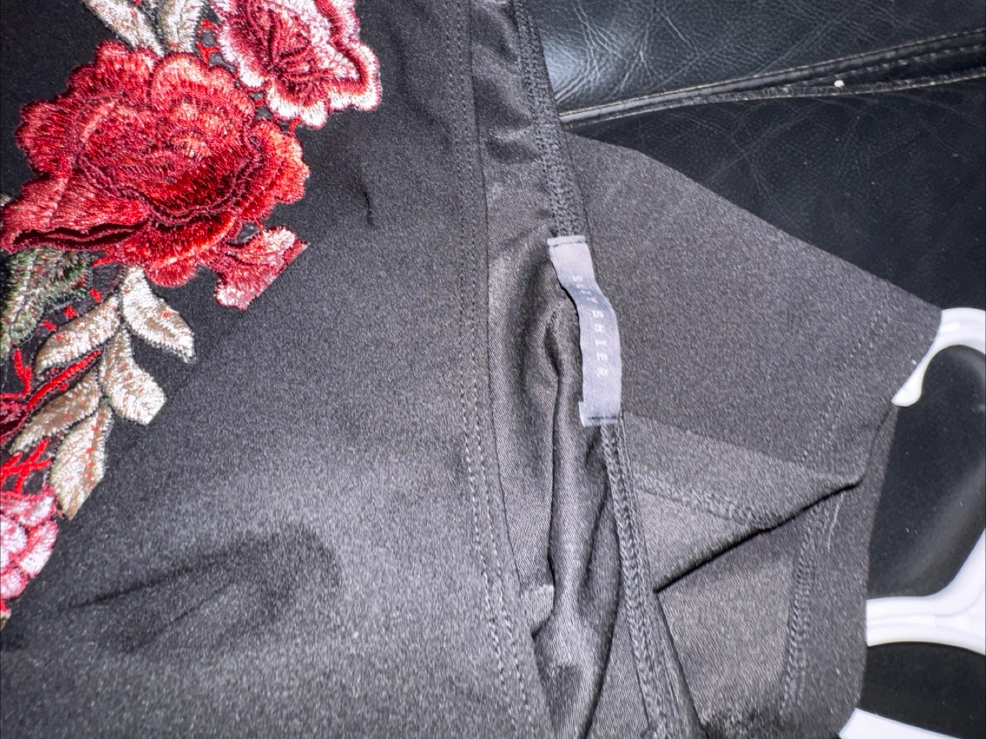 Beautiful black dress. Floral embroidery. Short sleeves. Off-the-shoulder neckline.
