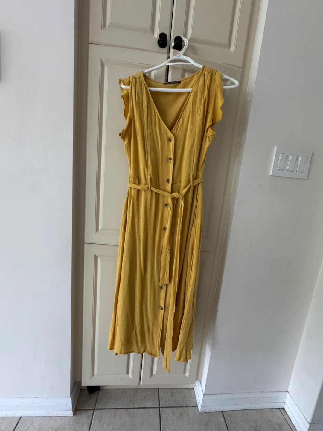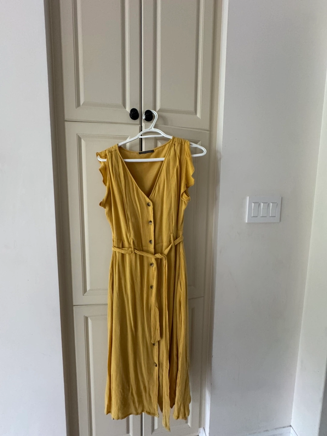 Flowy midi dress. Mustard yellow colour. Features a V-neck, button-down front, and a self-tie waist belt. Short flutter sleeves. Relaxed fit.