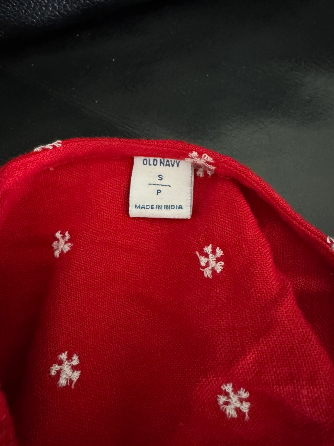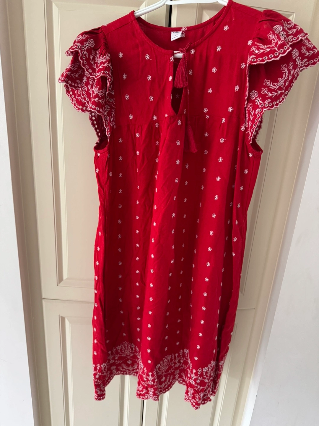 Red summer dress. Small size. Features embroidered details and flutter sleeves. Made in India.
