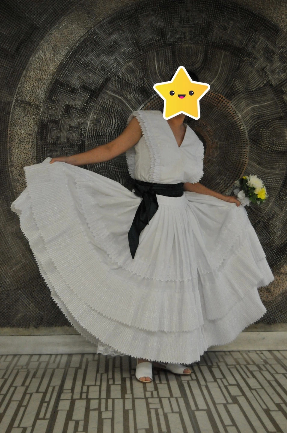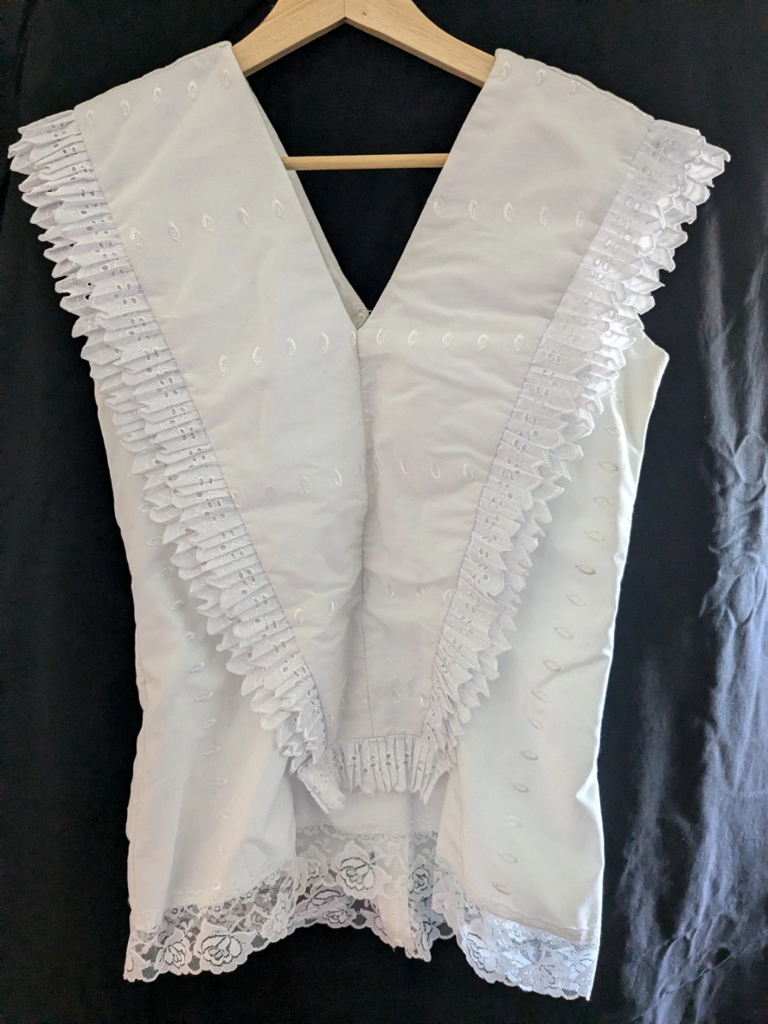 Beautiful two-piece custom-made wedding dress in Peruvian marinera style, size 8 (also fits size 6). The sleeveless top and the 12-metre beautifully laced dress can be worn separately. Dark green sash and hair pins included. Everything was only worn once.