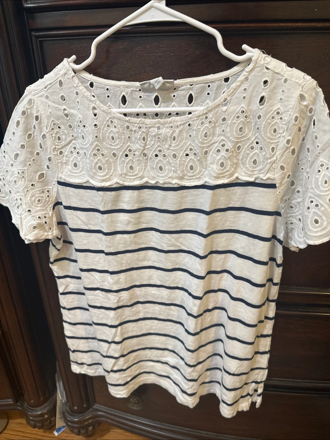 Women's size large T shirt. Striped top with eyelet detail. Short sleeves. Cream and navy colors.