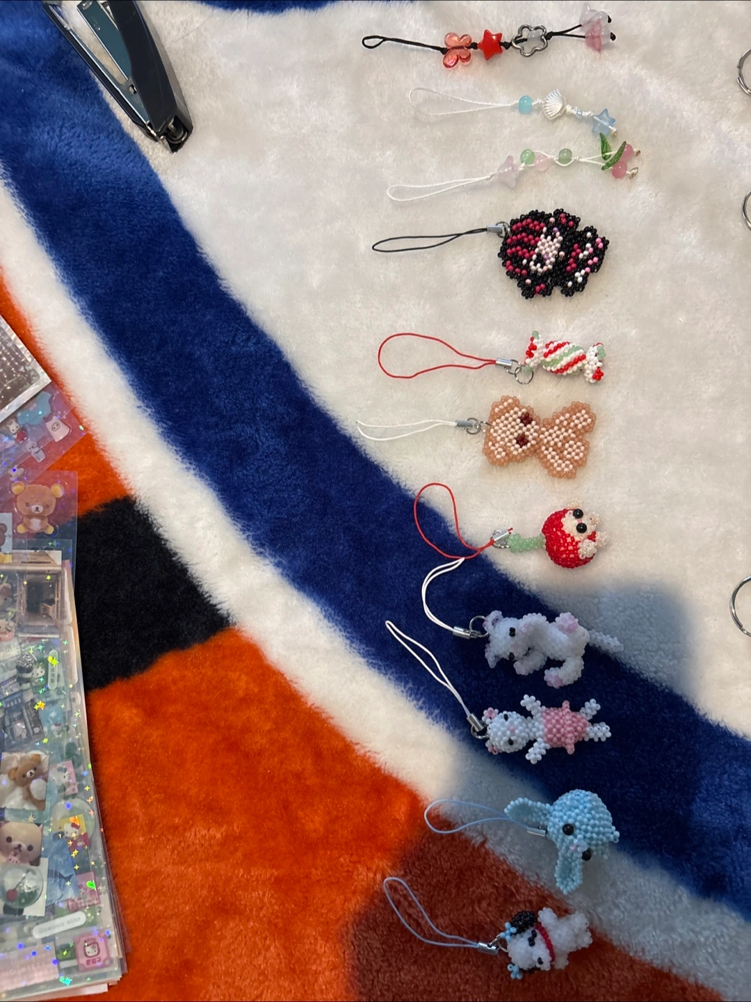Collection of cute beaded keychains and phone charms. Various designs including animals, characters, and more. Perfect for bags, keys, or phones. Great gift or addition to any collection. The first photo 5$ each,the second 10$ each