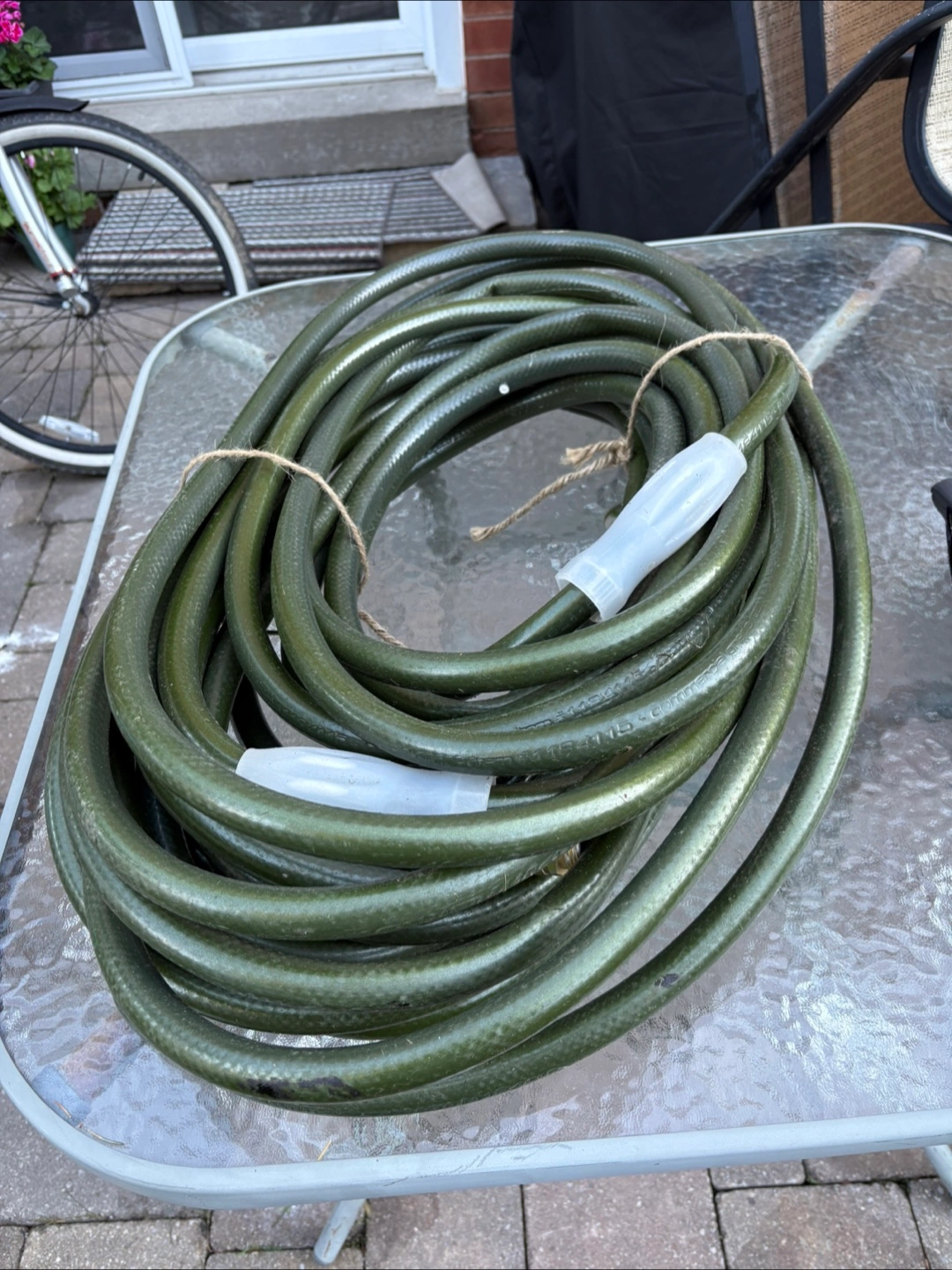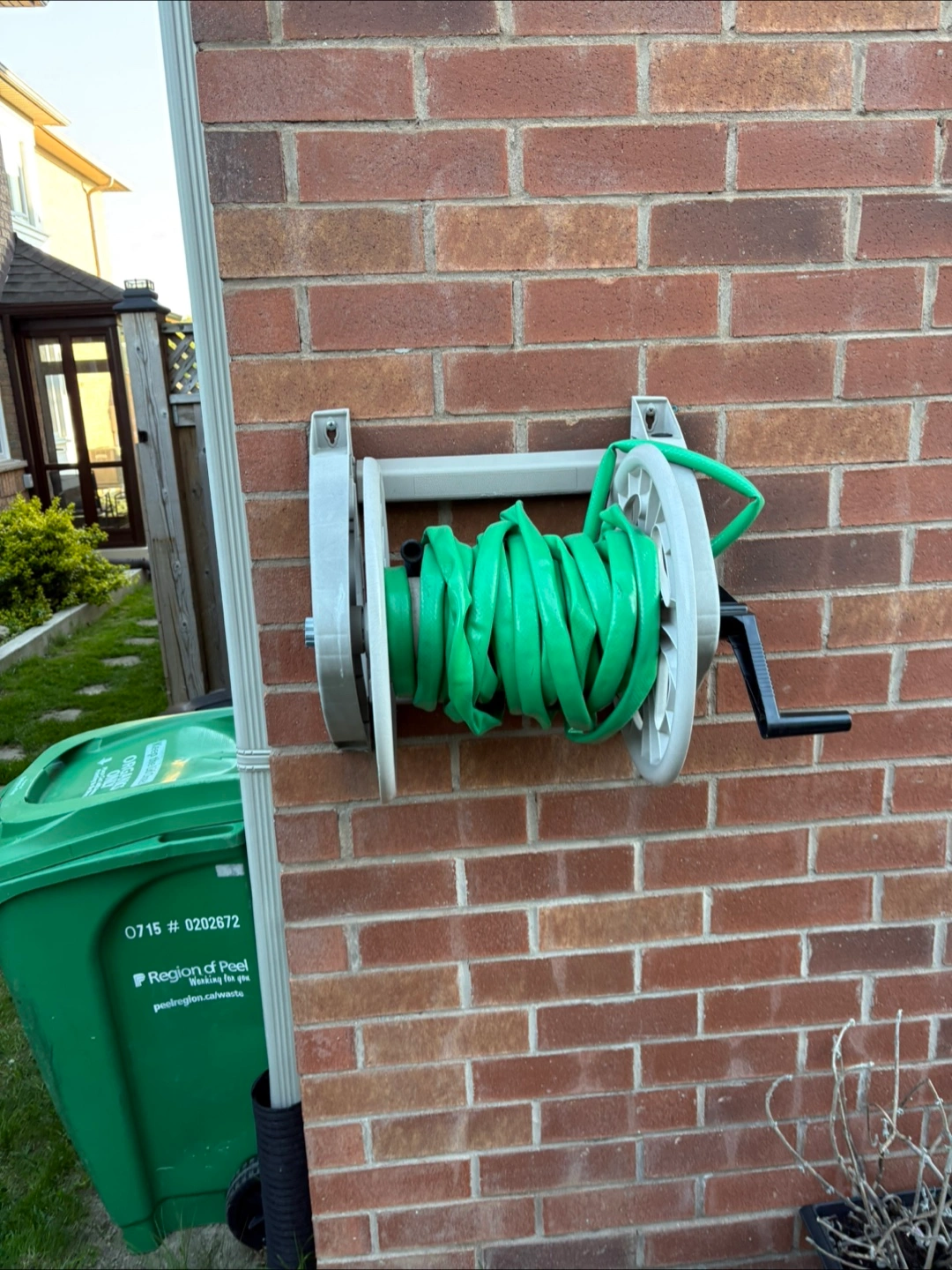 Wall-mounted hose reel. Green hose not included. Good condition.