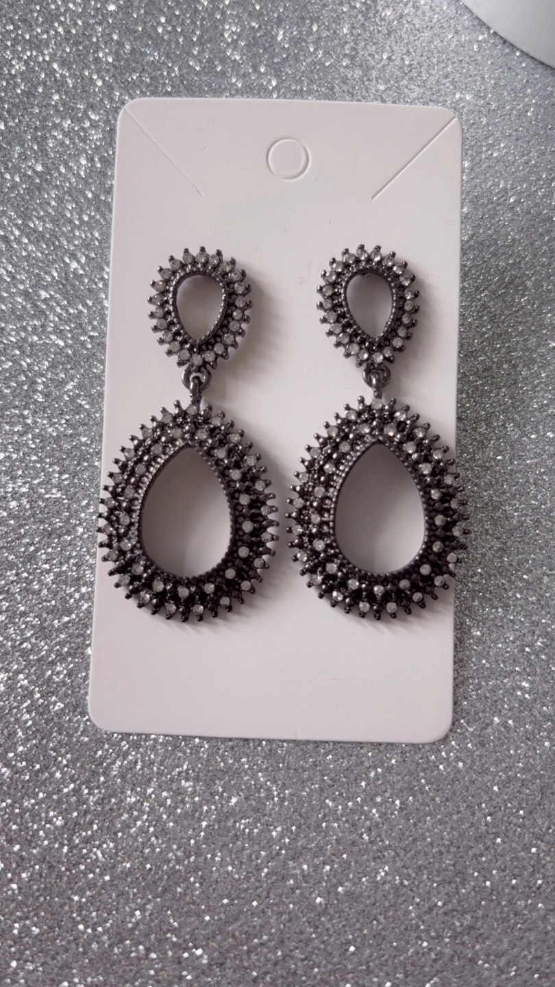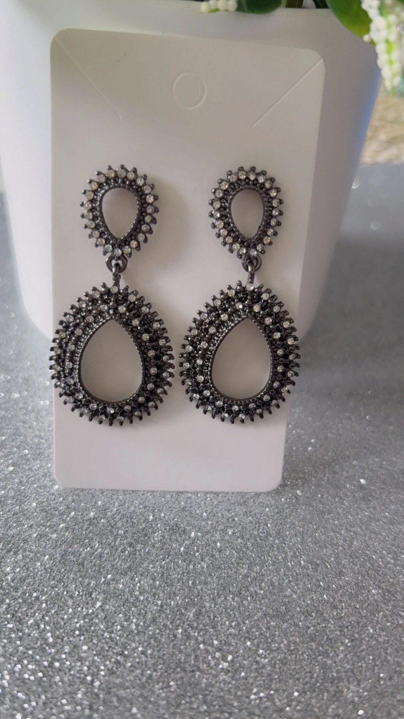 244Stunning dangle earrings. Gunmetal finish. Features clear crystals. Two-tiered design. Perfect for adding sparkle to any outfit.