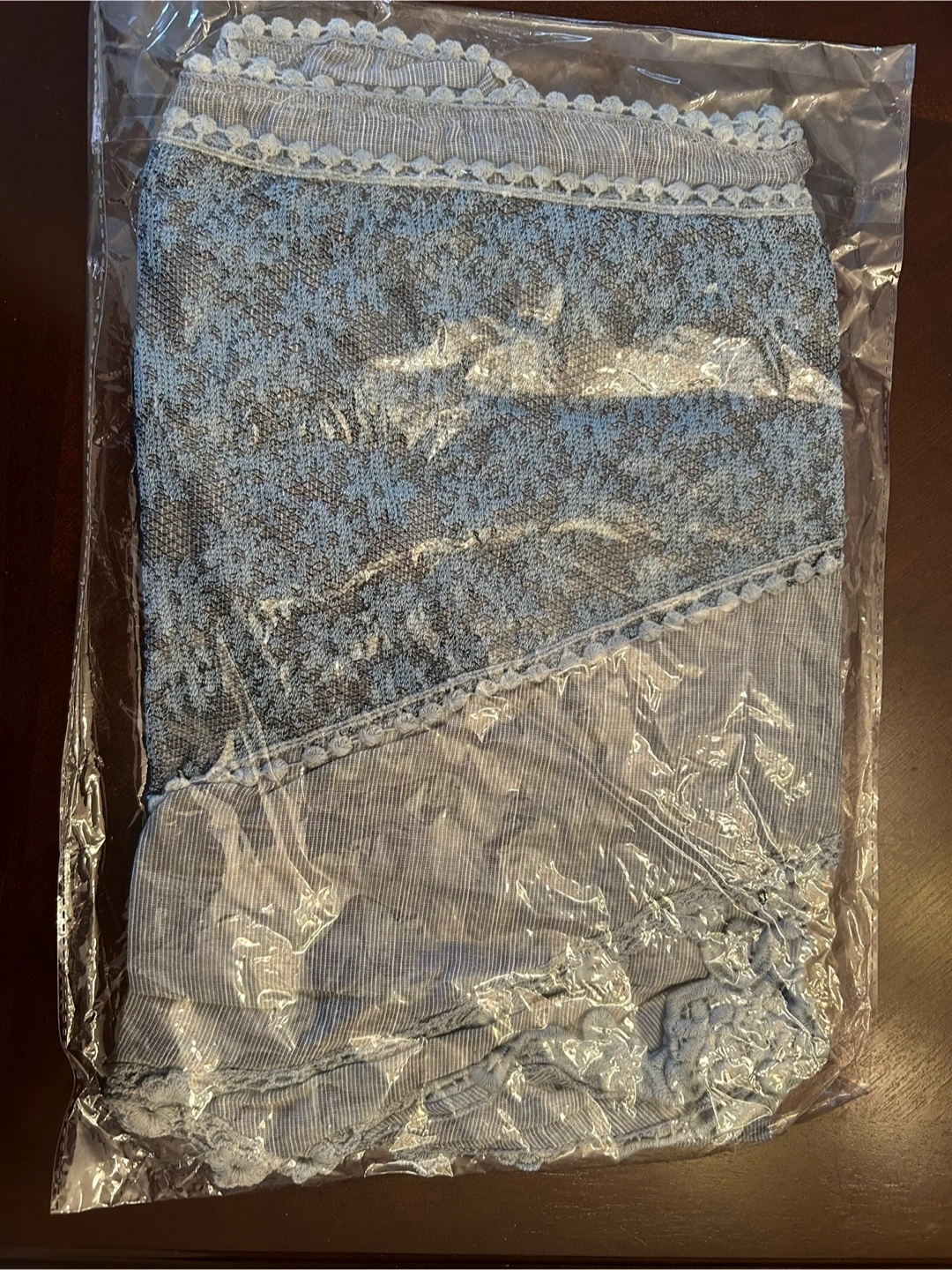 Features blue lace and grey cotton. Unique design. Lightweight fabric. Perfect for summer.