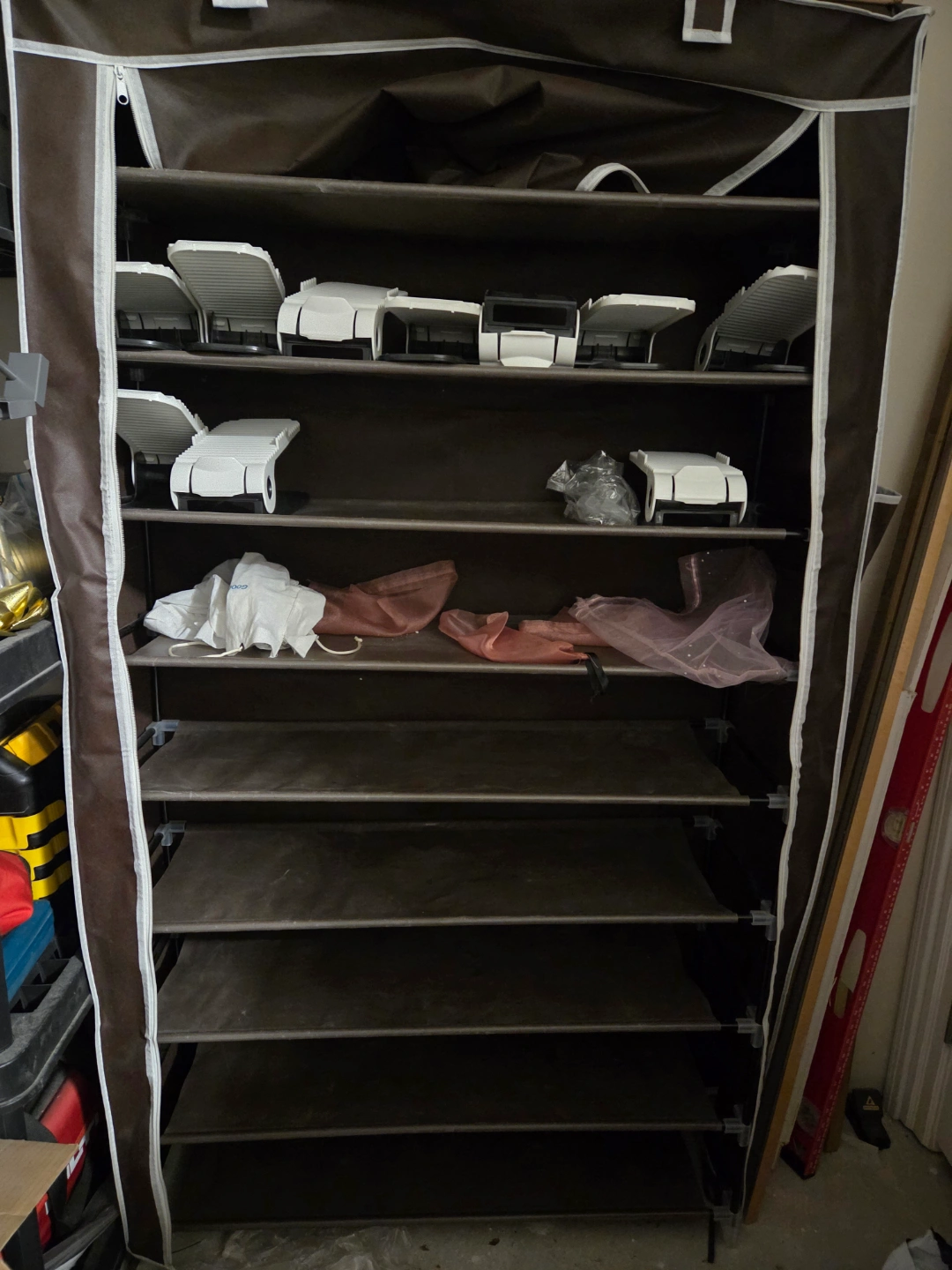 A fabric zip cover shoes storage shelving rack, a 9 tier shelf rack that can store 40+ pair of shoes along with the 10pcs of adjustable shoes stackers provide with this unit.