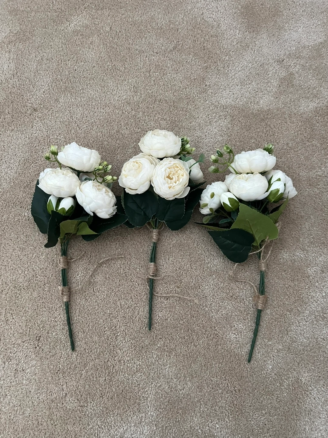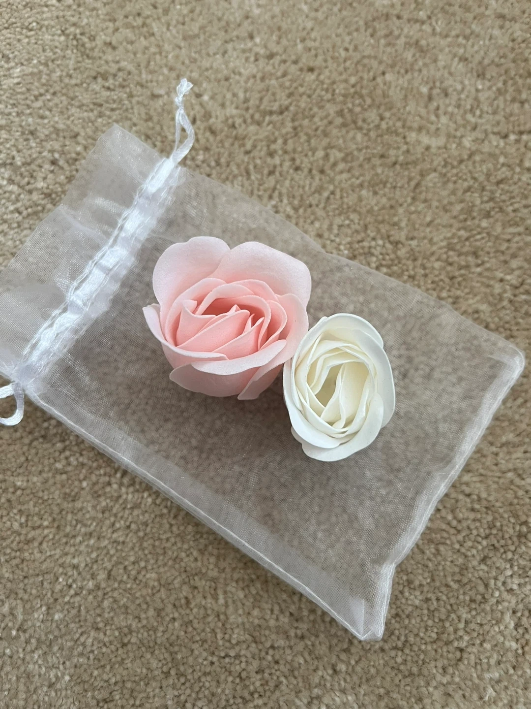 24 wedding favours (pink & white soap roses in white mesh bag)
