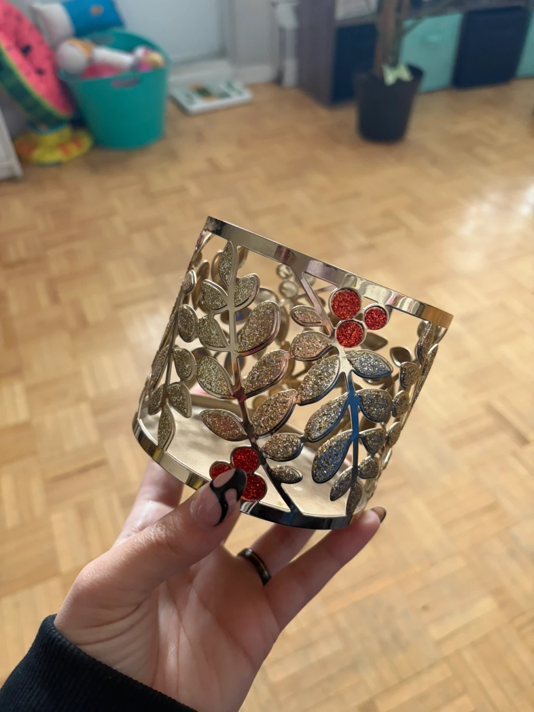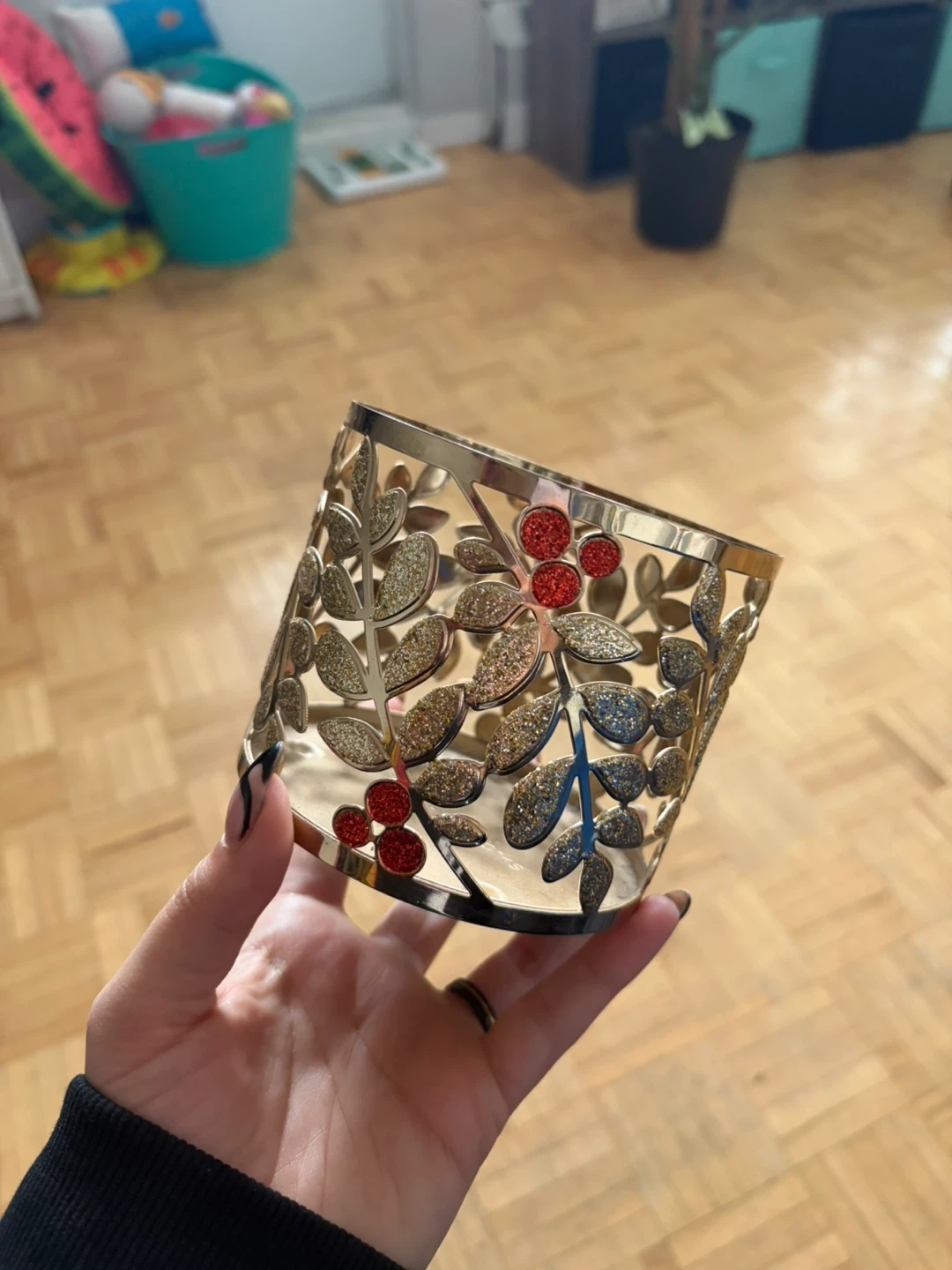 This is a festive candle holder from Bath & Body Works. It features a gold-toned metal design with cutouts of leaves and red berries, accented with glitter. It's designed to fit standard Bath & Body Works 3-wick candles. This holder would add a touch of holiday cheer to any room!