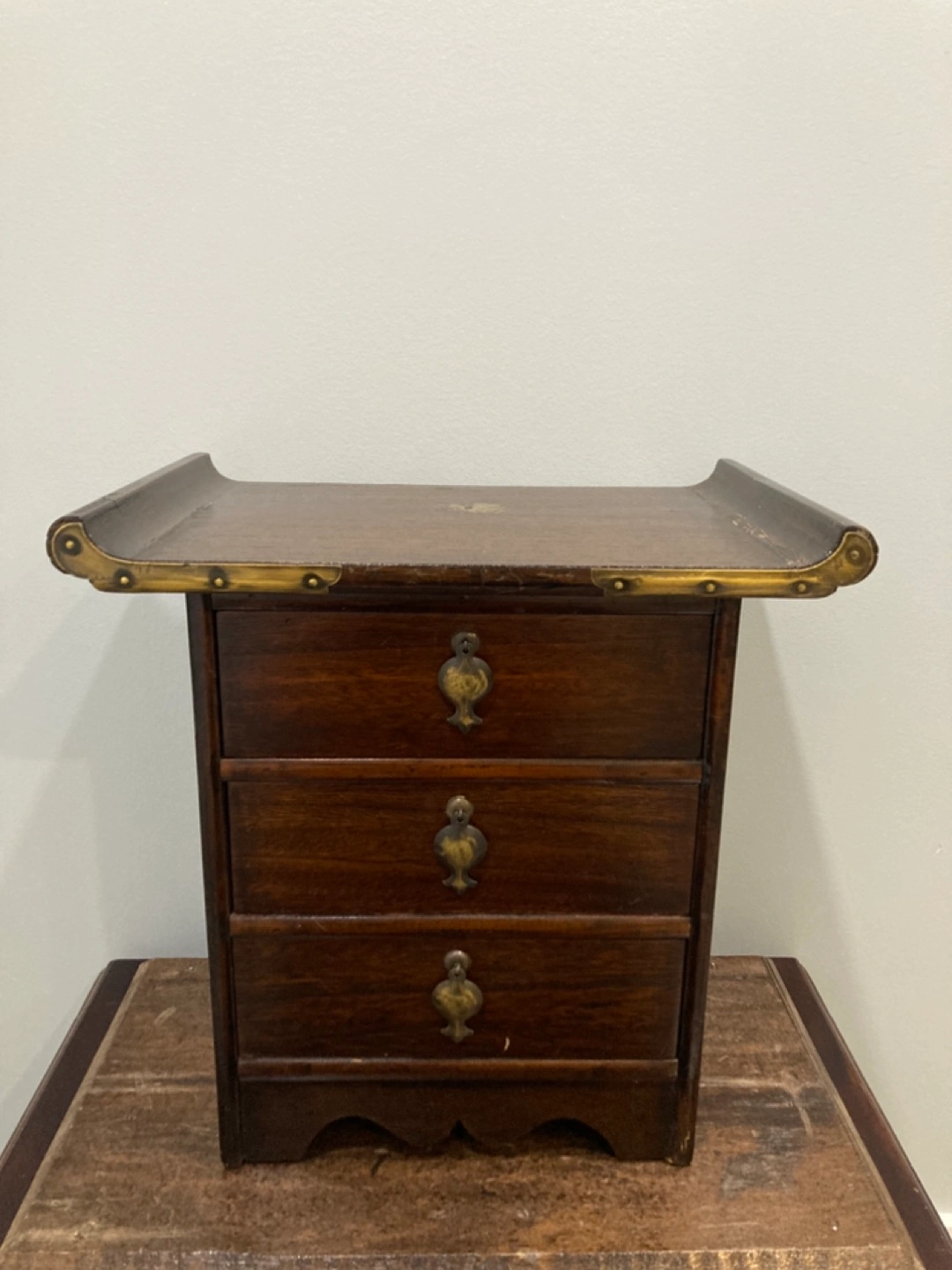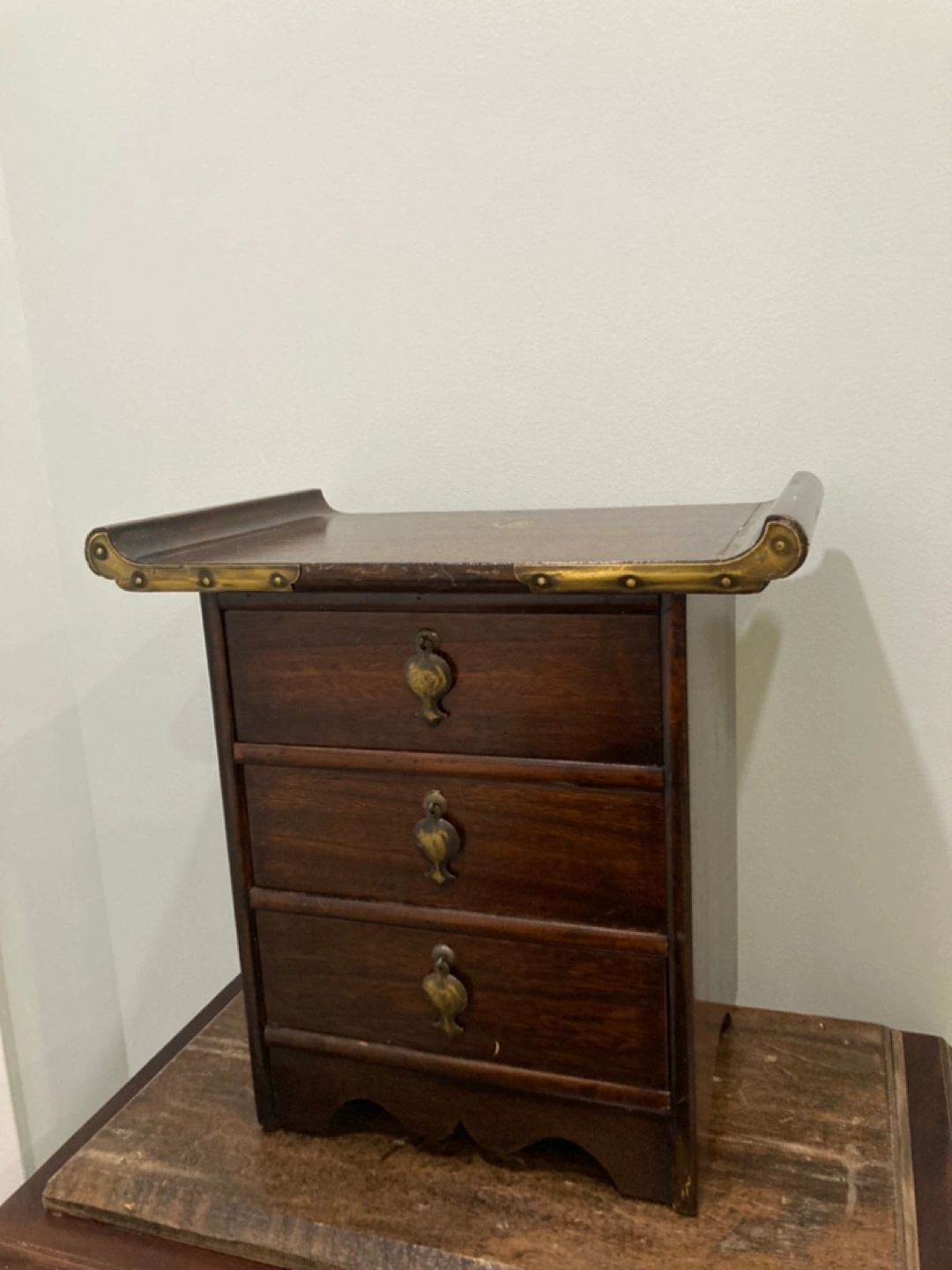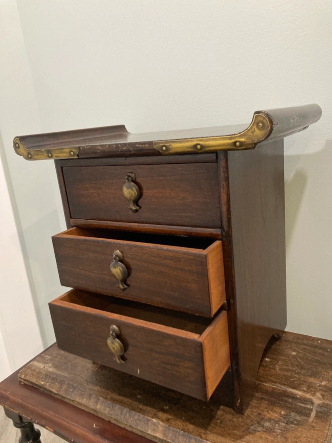 Small wooden chest. Three drawers, brass accents. Dark wood finish. Unique design. Perfect for jewellery or small items.