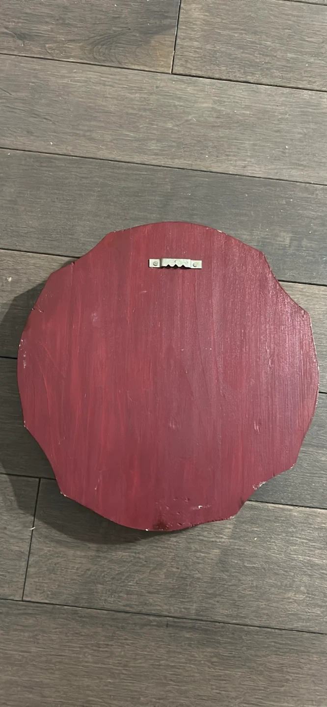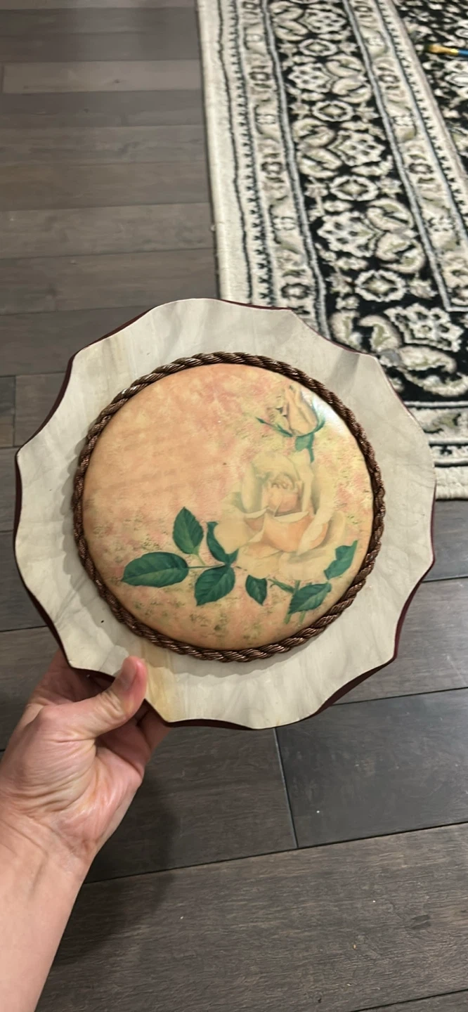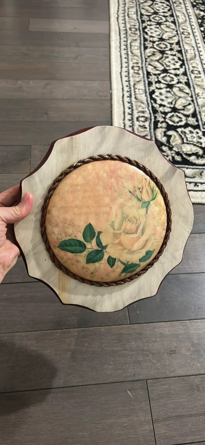 This decorative wall plaque features a floral design with a yellow rose and green leaves. It has a scalloped wood edge and a braided trim. The back is solid red and includes a sawtooth hanger for easy wall mounting.