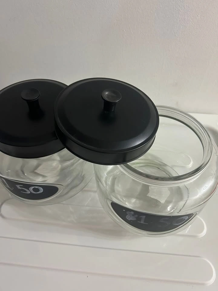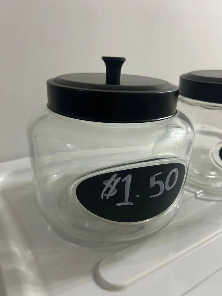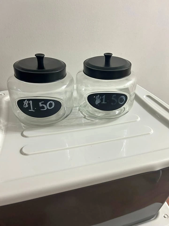 Two 108 oz storage jars, $10 each. Each jar has a chalkboard writing area (9"L x 9"W x 11.5"H). The writing area was made with marker, so it will need to be painted over with chalkboard paint. You can find chalkboard paint at Michaels or Walmart in the craft section. Pick up is available in Vaughan Monday-Thursday until 4 pm, or in Beeton during evenings and weekends. Please see my other listings for more great deals!