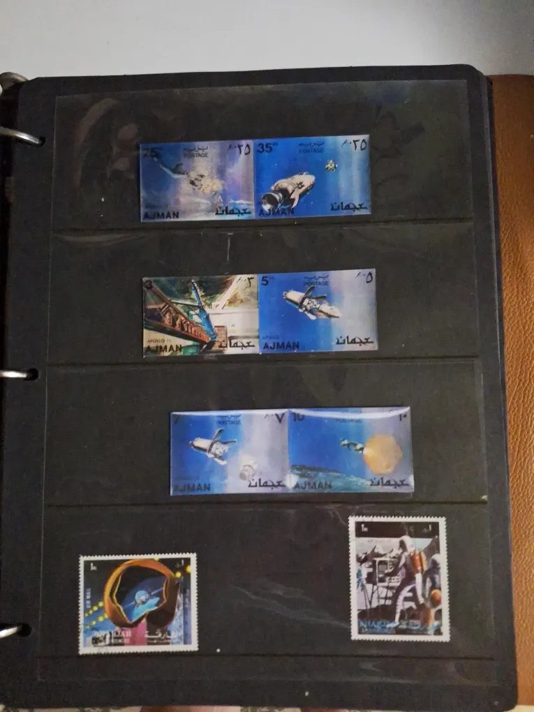 This listing includes multiple postage stamps from Ajman depicting space themes. The stamps show various spacecraft and celestial bodies. Some stamps have denominations of 35 and 25 fils. This would appeal to stamp collectors and space enthusiasts.