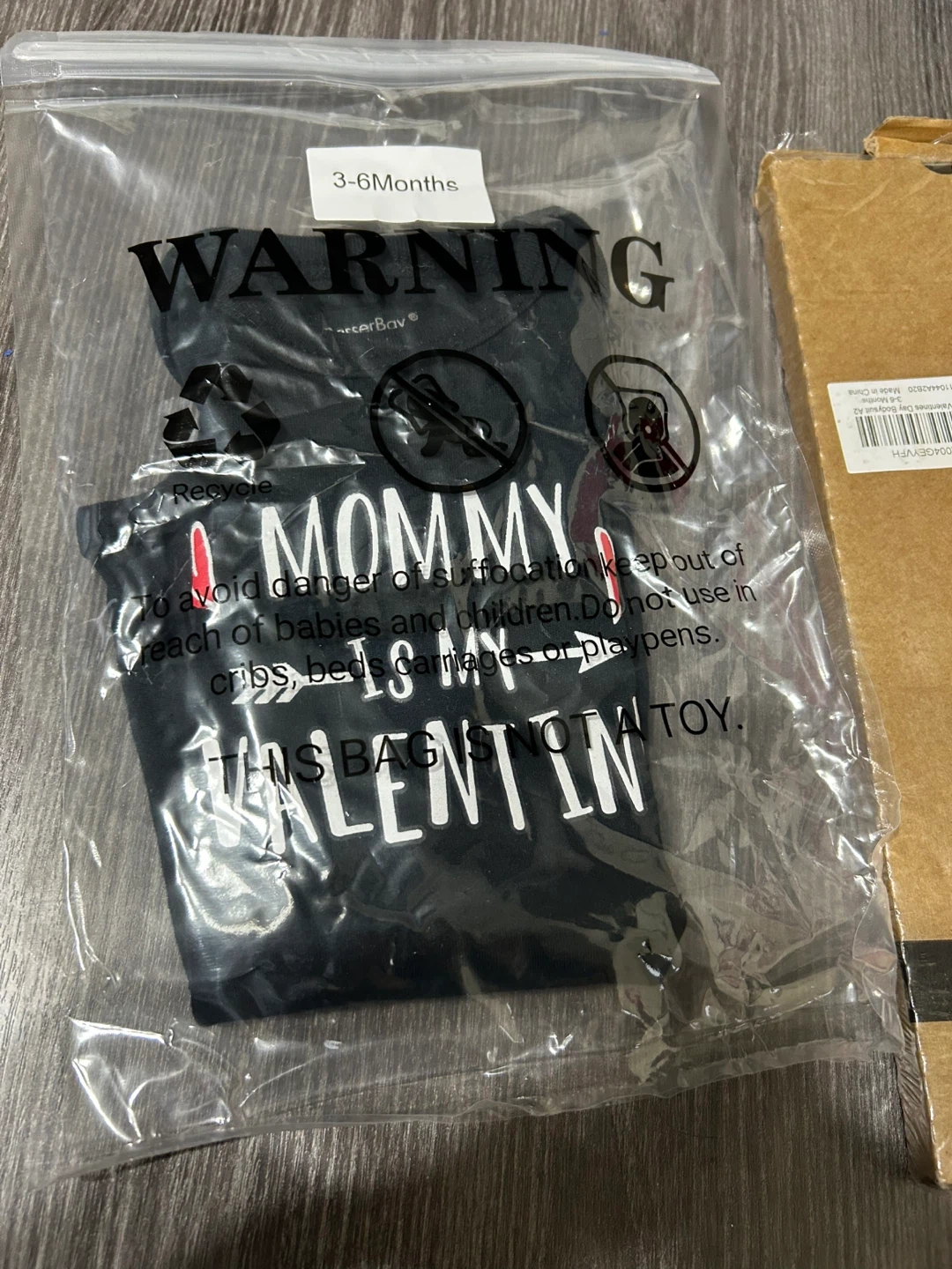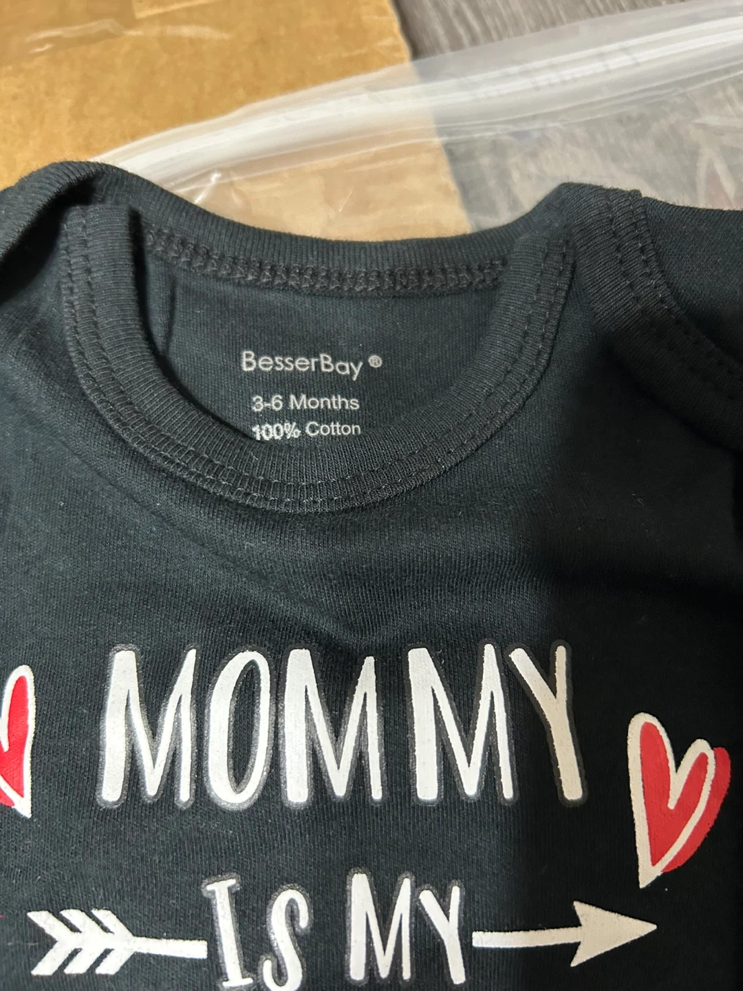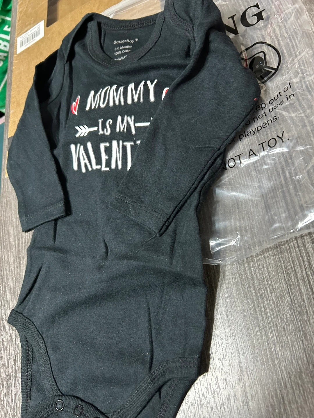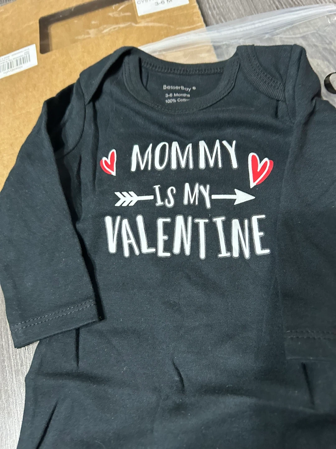 This black, long-sleeved baby bodysuit from BesserBay says "Mommy Is My Valentine". It's made of 100% cotton for comfort. It's a size 3-6 months. Perfect for Valentine's Day! Pick up at Islington /401 / bergamot avenue Etobicoke.