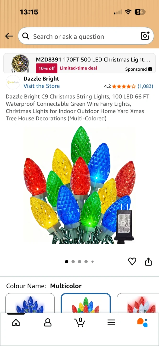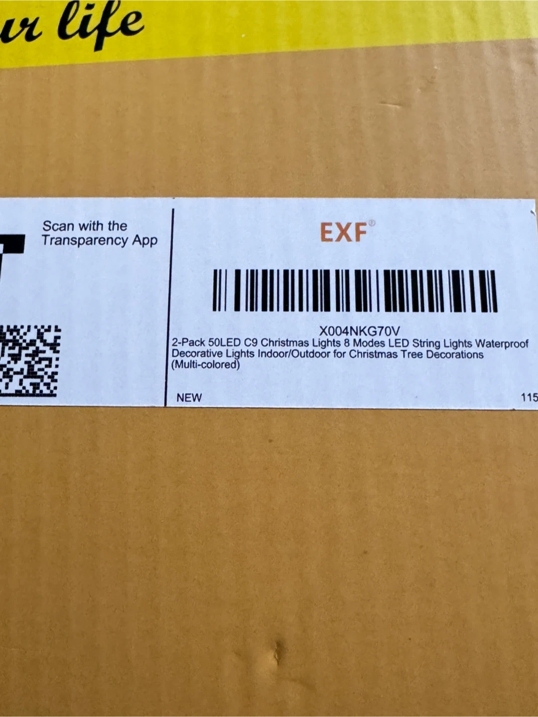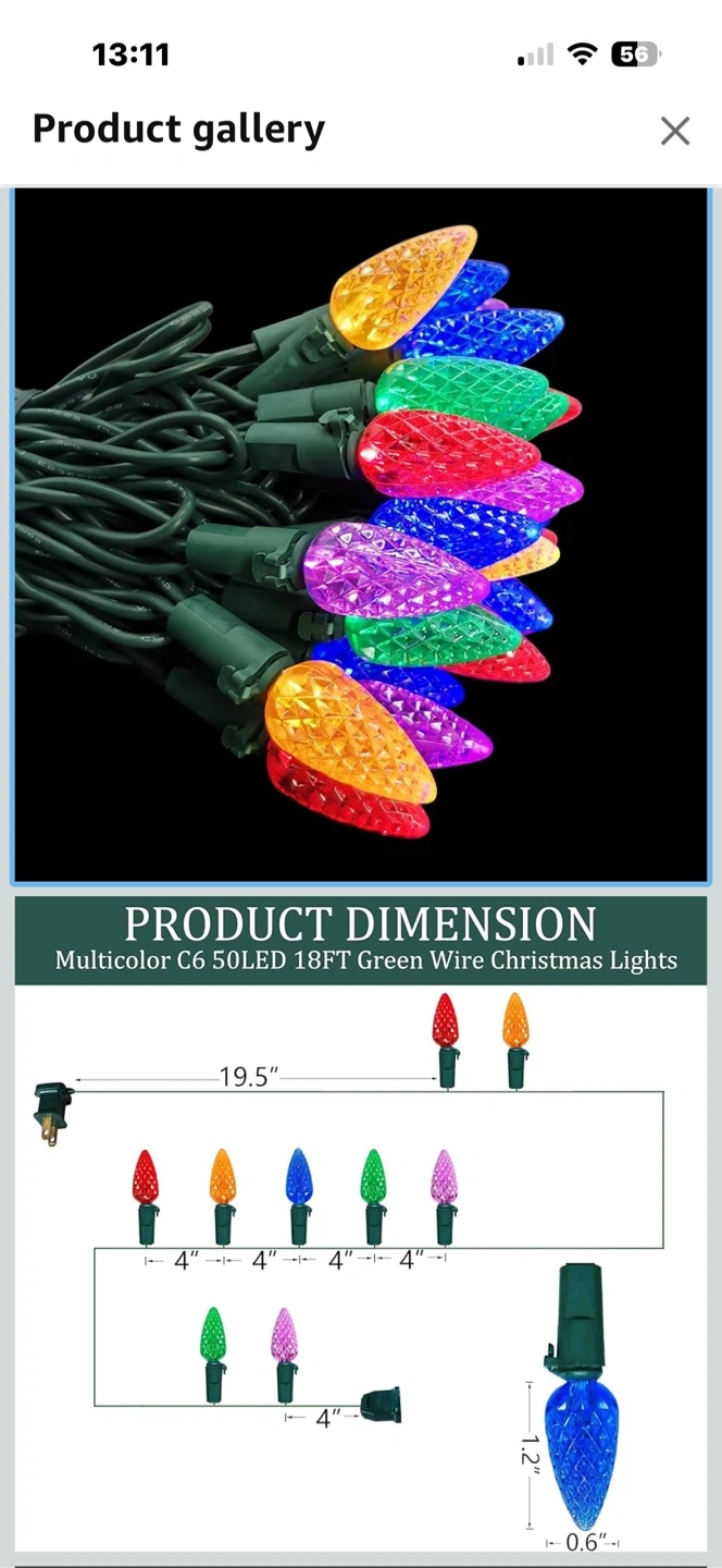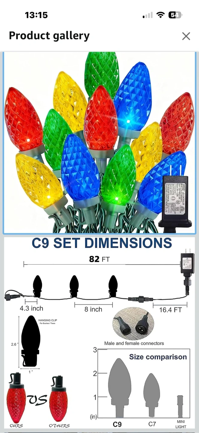 These EXF C9 string lights come in a 2-pack, with each string being 50FT long. They are multicolor and waterproof, suitable for indoor or outdoor Christmas tree decorations. The lights feature male and female connectors and are designed for easy connection.