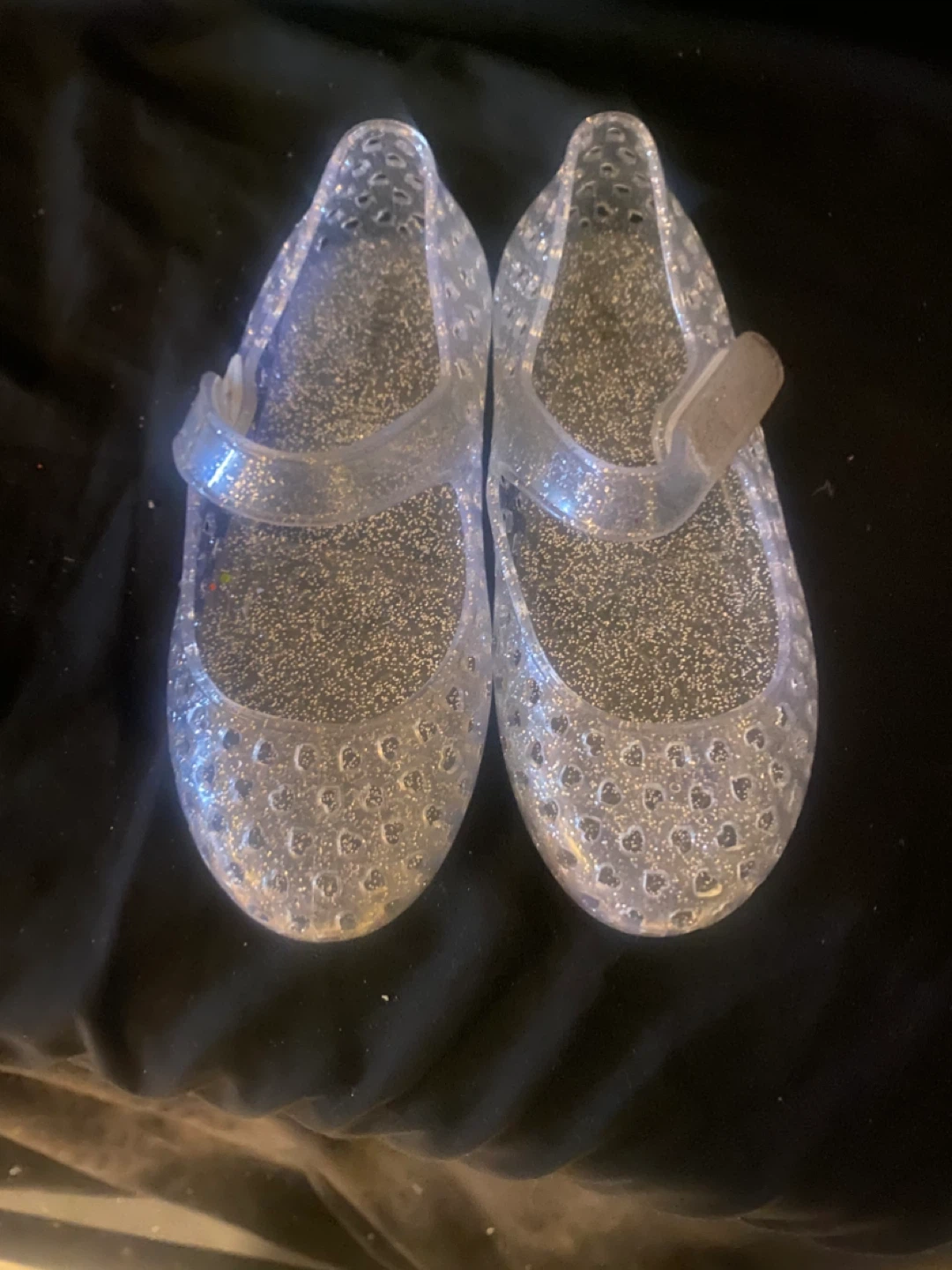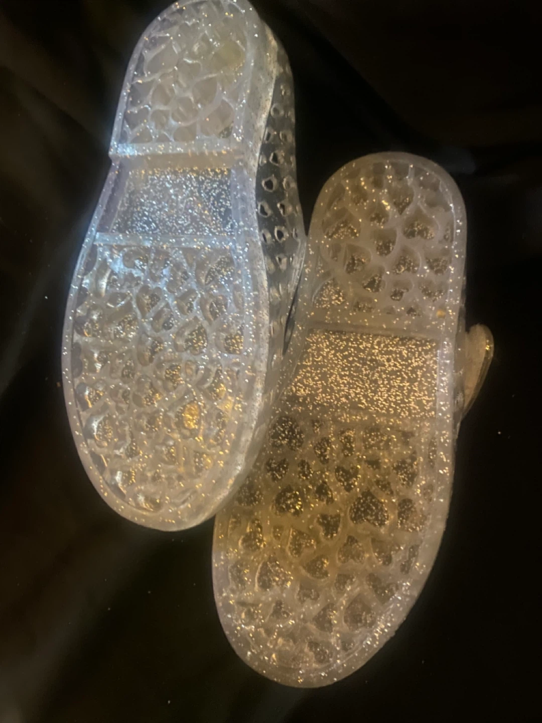 Toddler Mary Jane style jelly shoes in a clear, glitter-infused material. These shoes feature a strap closure and a decorative heart pattern on the soles. They're made of PVC material.