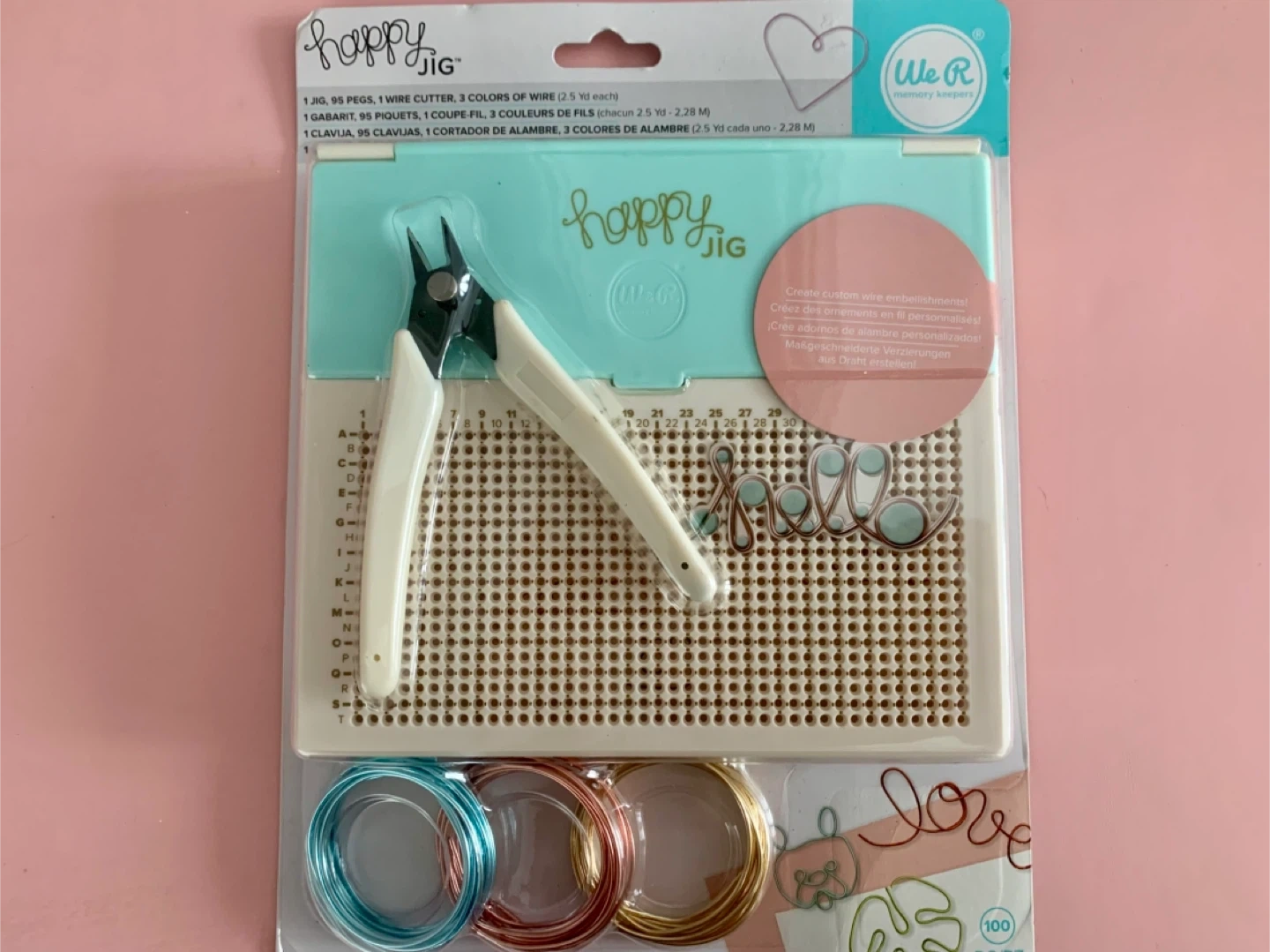 This We R Memory Keepers Happy Jig set includes a wire cutter, 99 pegs, and 3 colours of wire. It's designed for creating custom wire embellishments for crafts. Over 100 design templates are available online.