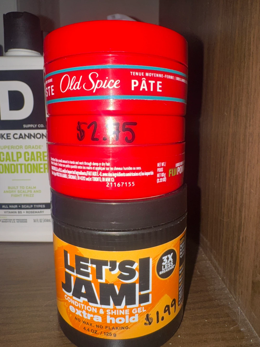 Selling Old Spice Pâte and Let's Jam Condition & Shine Gel. The Old Spice Pâte is for medium hold and shine. The Let's Jam gel provides extra hold and is formulated without wax or flaking. It contains 4.4 oz / 125g