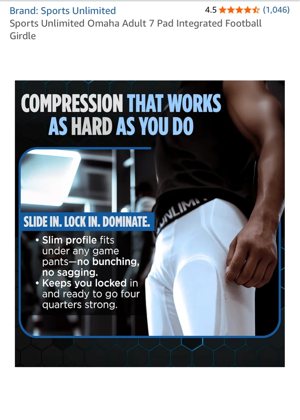 Lightweight girdle for football, designed to be worn beneath padded pants. It features a 10-pad integrated design for added protection at the hips, thighs, knees, and tailbone. Compression fit allows for a fuller range of motion on the field. Includes a football pad with a cup pocket (cup not included). Available in sizes S (28-30") to 4XL (46-50").