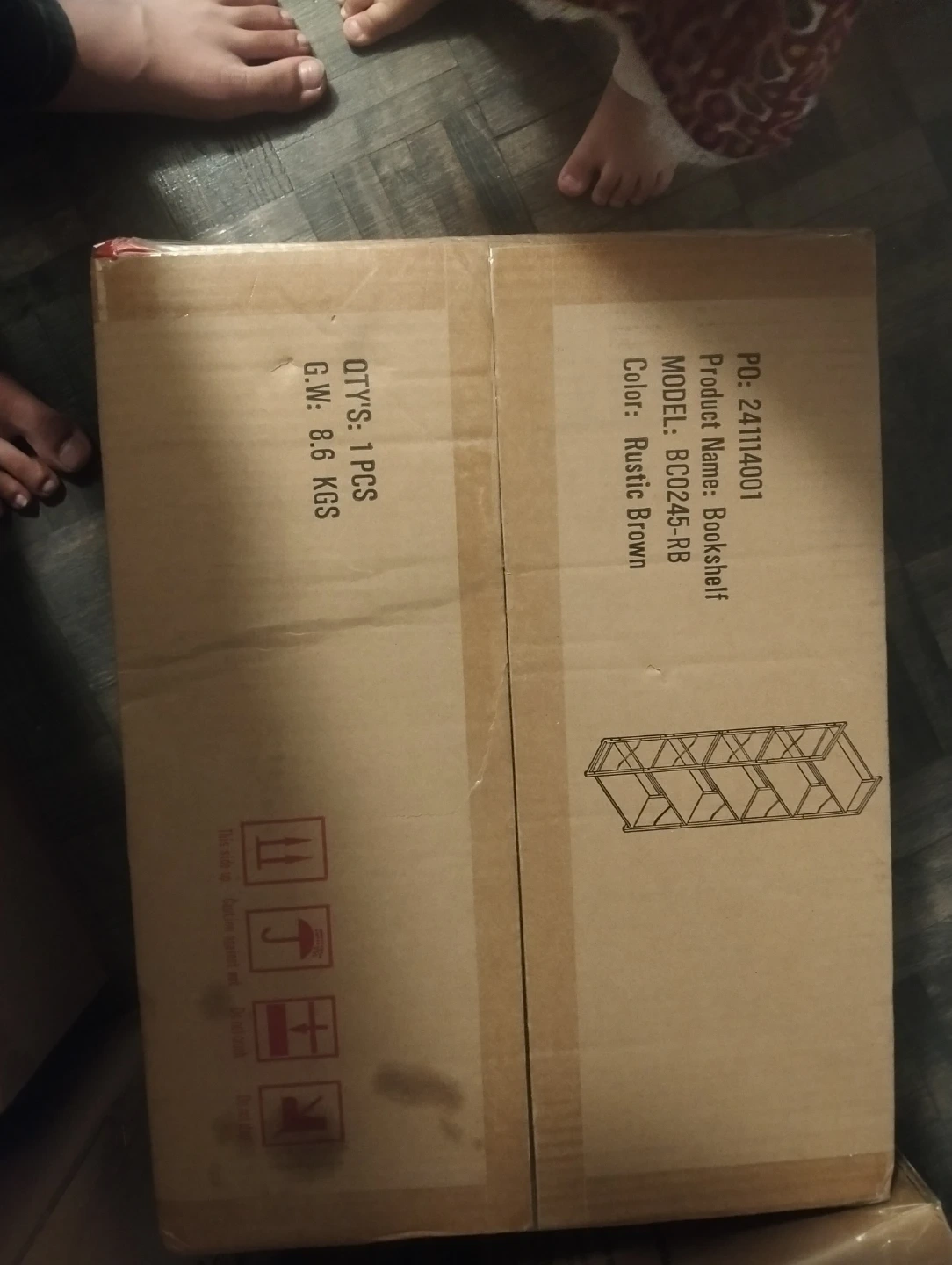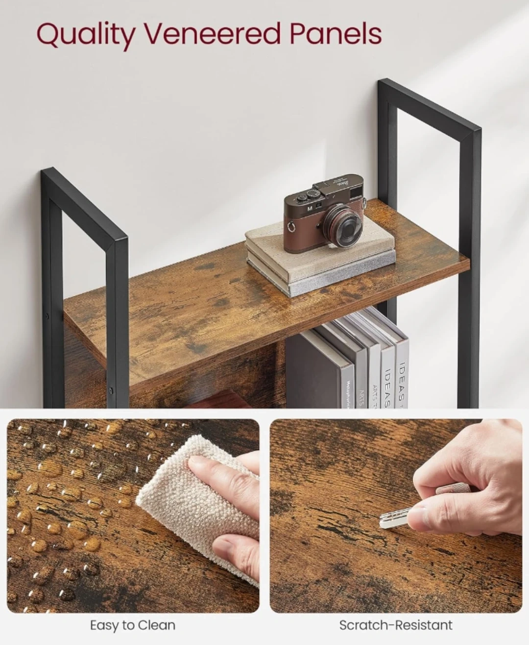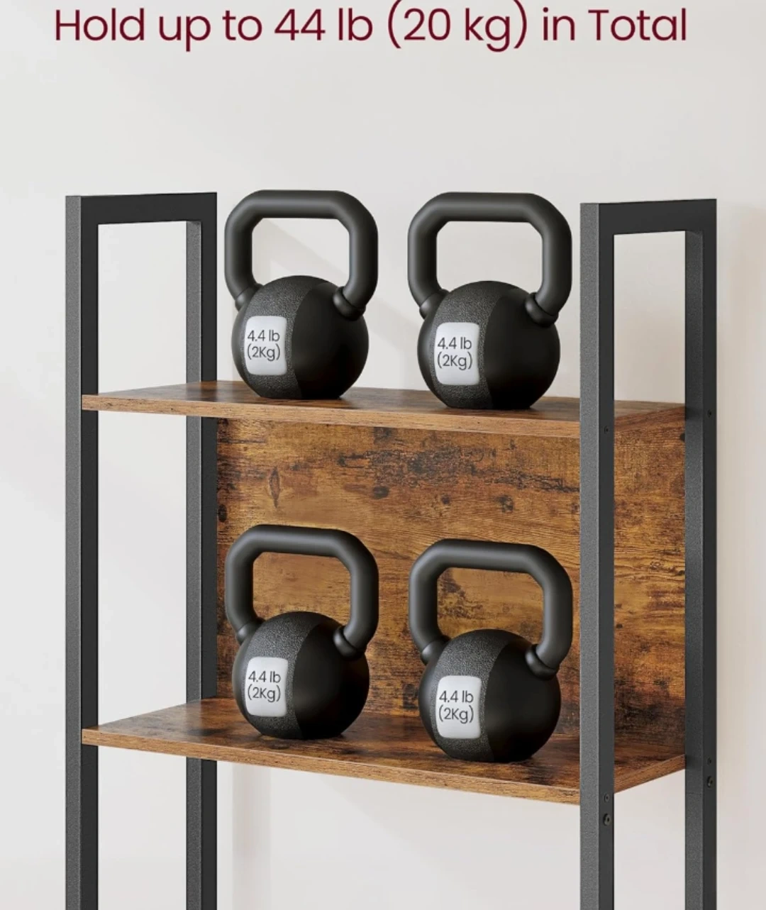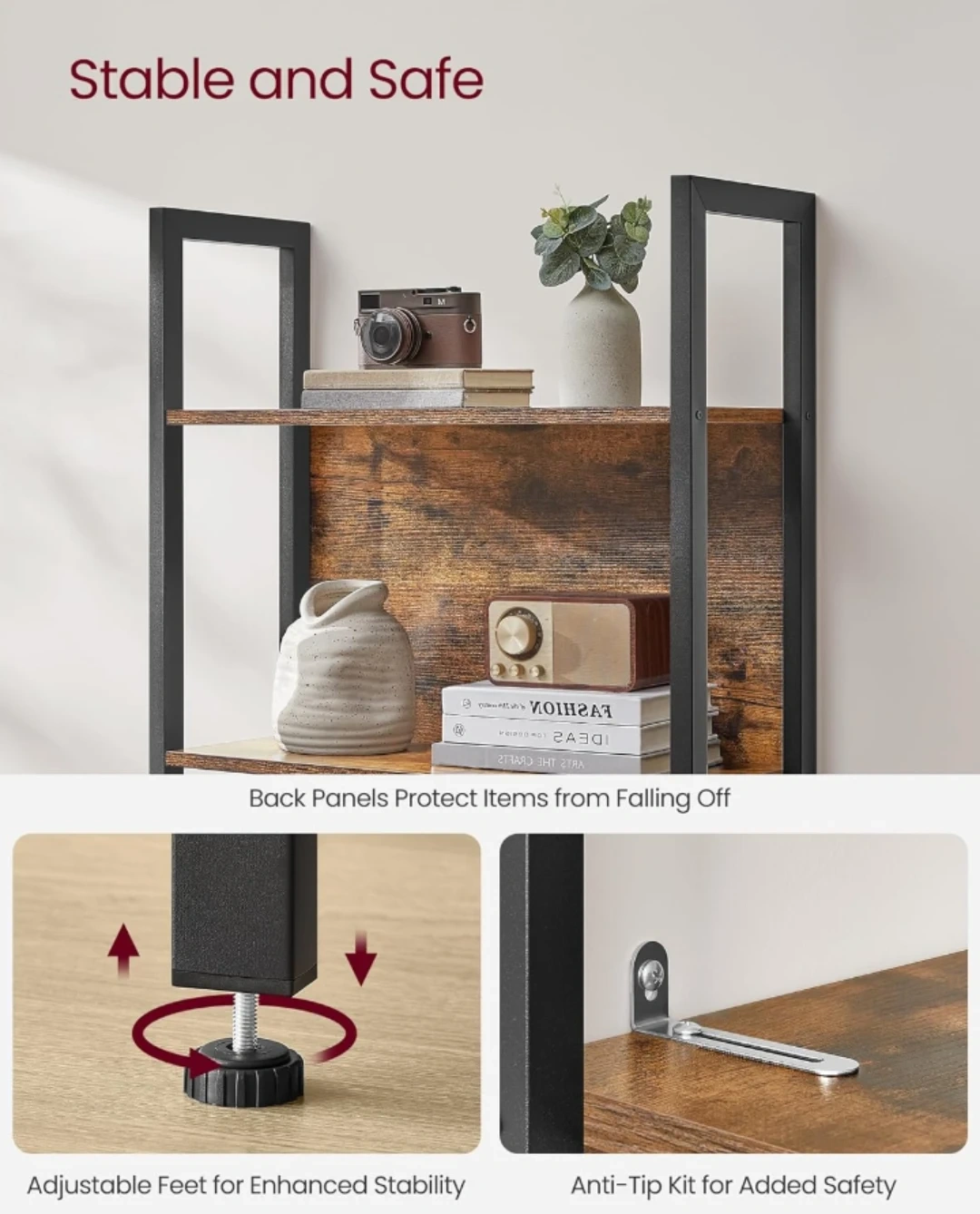 VASAGLE 5-shelf bookcase with metal frame. Features quality veneered panels, back panels to protect items, and adjustable feet for stability. Each shelf holds up to 44 lb (20 kg). Measures 65" H x 24.4" W x 9.4" D.