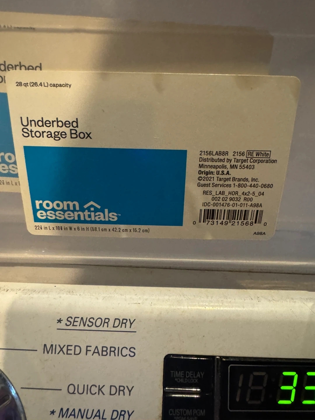 This underbed storage box is clear with a white lid. It's 28 qt (26.4 L) capacity. Dimensions are 22 in L x 16 in W x 6 in H (56 cm x 42.2 cm x 15.2 cm). Perfect for storing items under your bed!