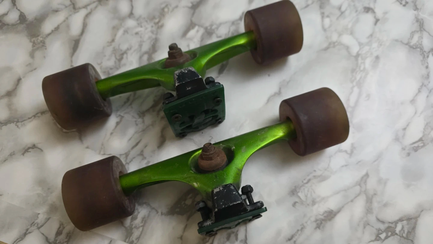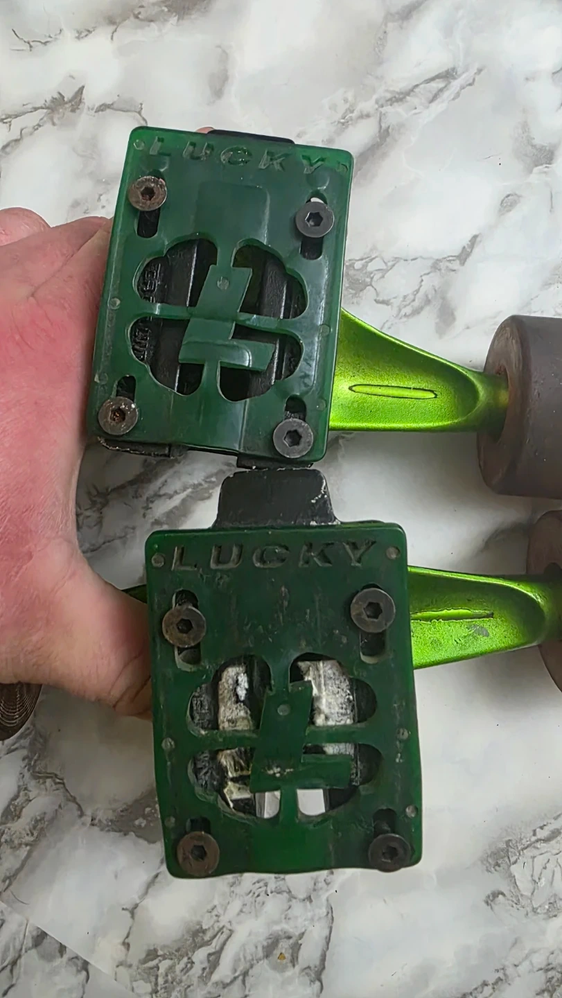 I did not use these long. bearings are old but has purple penny wheels lucky truck risers reds hard x2 bushings comes with extra hardware and skate tool like new used once or twice. Selling As a whole