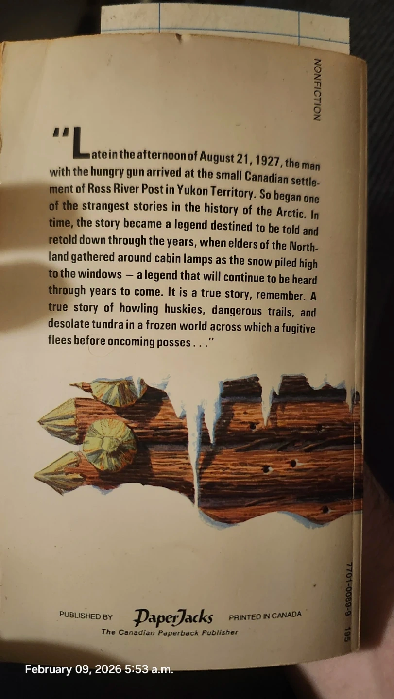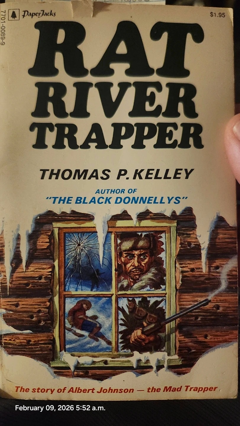 This paperback book, "Rat River Trapper," is written by Thomas P. Kelley. It tells the story of Albert Johnson, the Mad Trapper. Published by PaperJacks in Canada. Okay Condition