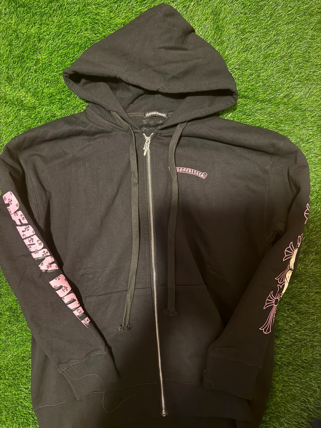 Black Chrome Hearts zip-up hoodie with graphic prints on the back and sleeves. Features the Chrome Hearts logo on the chest. Made for a stylish streetwear look.