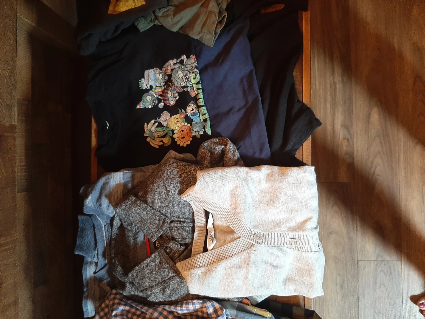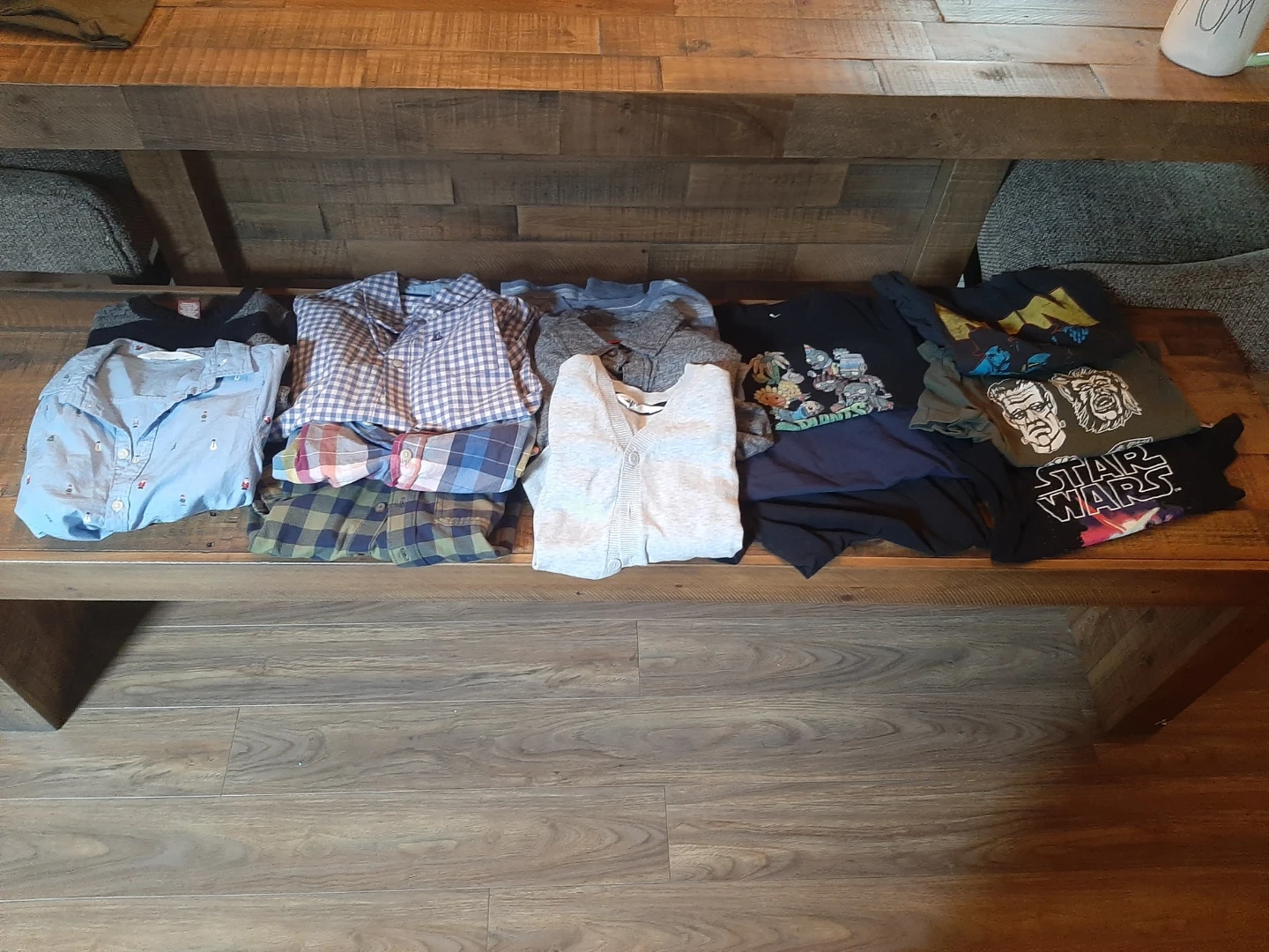 A collection of boy's tops including graphic tees with Star Wars and other designs, plus button-up shirts in various plaids and solids. All items are pre-owned and ready for a new wardrobe.