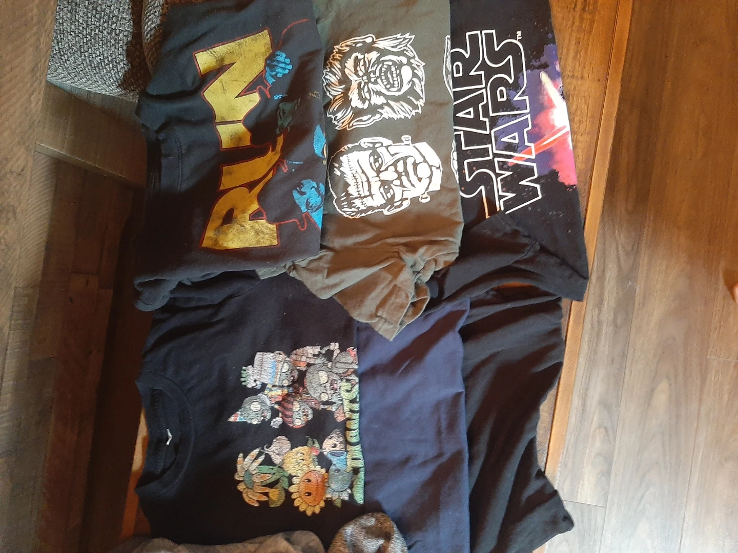 A collection of boy's tops including graphic tees with Star Wars and other designs, plus button-up shirts in various plaids and solids. All items are pre-owned and ready for a new wardrobe.