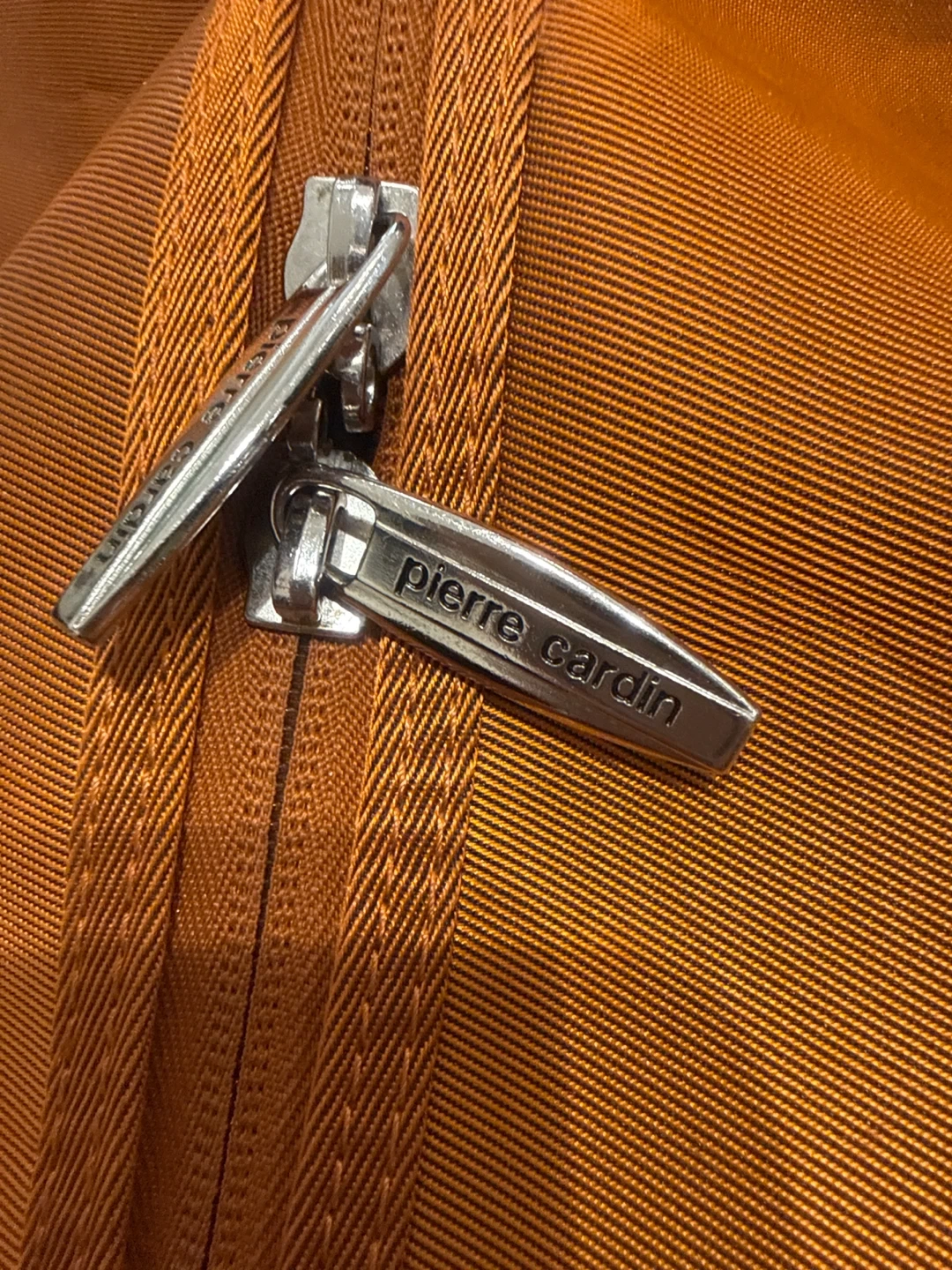 Orange duffel bag with navy blue accents. Features a zippered main compartment and an exterior zippered pocket. Durable nylon material.