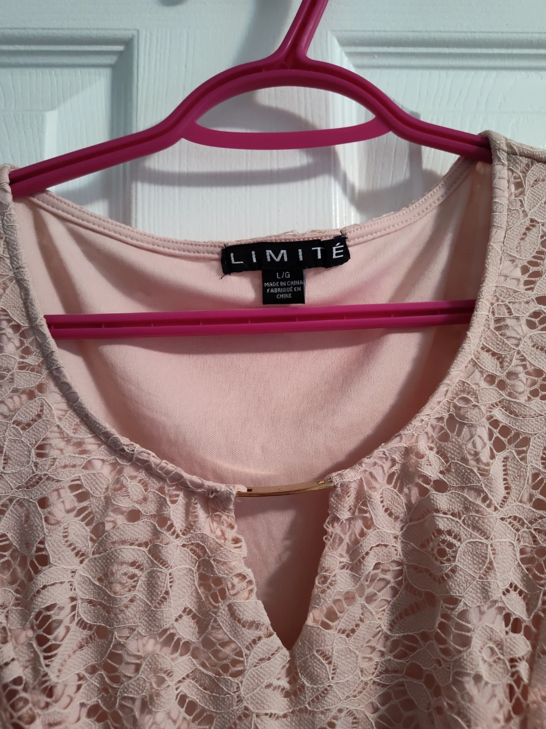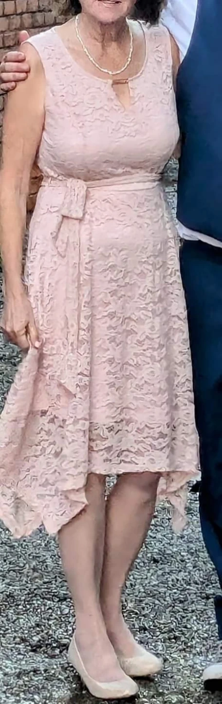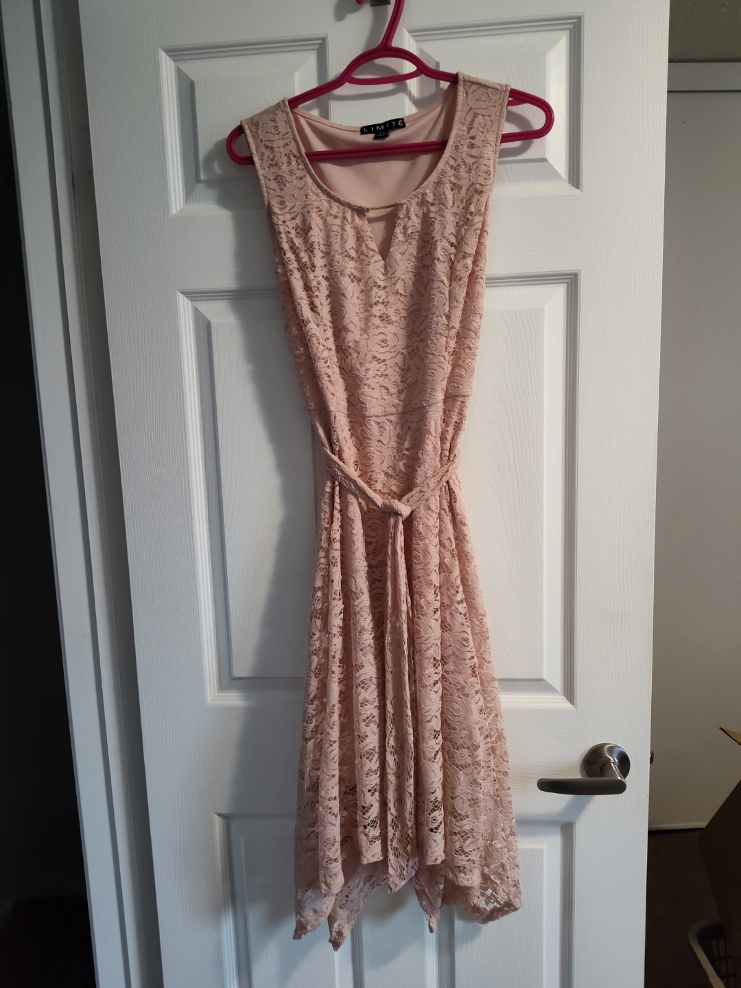 Great dress. Tag states large but it fits smaller. This lovely pink lace dress features a delicate floral pattern and a charming bow detail at the waist. It has a V-neckline with a subtle keyhole cutout and a flowing hemline. The lace overlay gives it a sophisticated texture, making it a great choice for special occasions. Worn once. Cash only, p/u Streetsville.