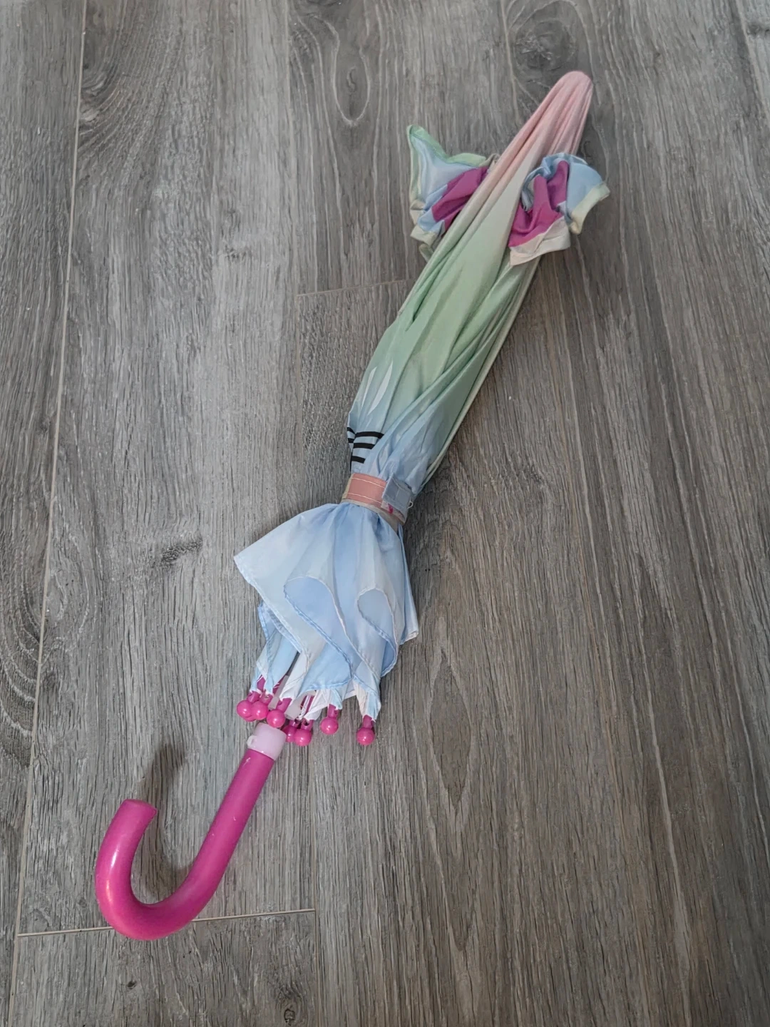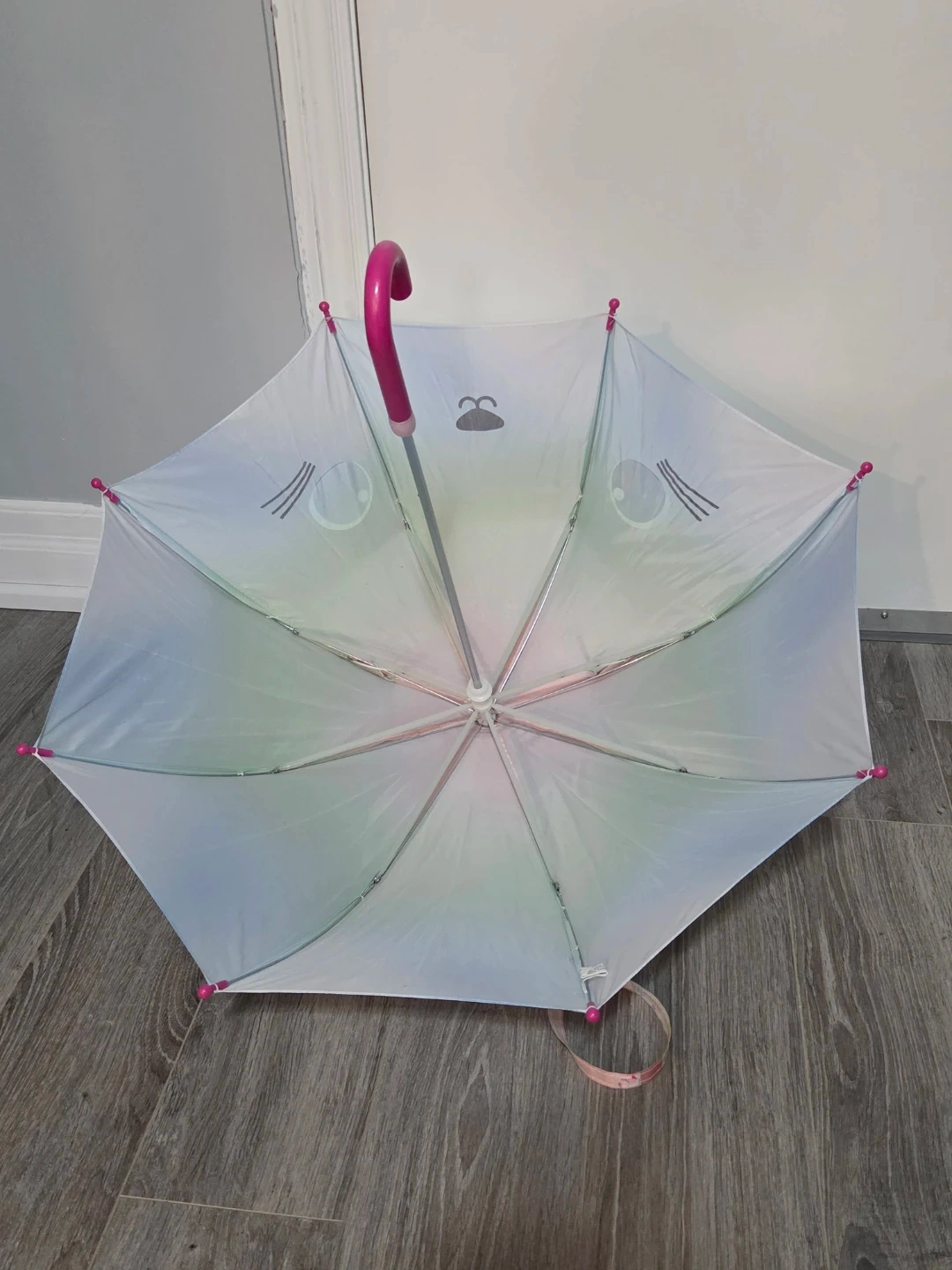 This cute umbrella features a fun bunny face and ears! It's designed for kids with a colourful, playful look. Comes with a pink handle and matching pink tips on the frame.