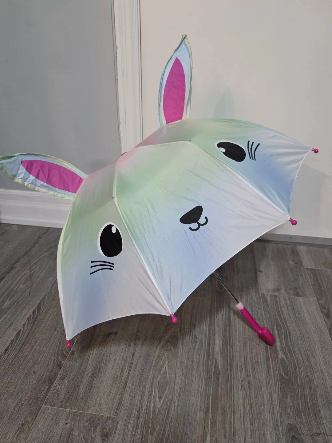 This cute umbrella features a fun bunny face and ears! It's designed for kids with a colourful, playful look. Comes with a pink handle and matching pink tips on the frame.