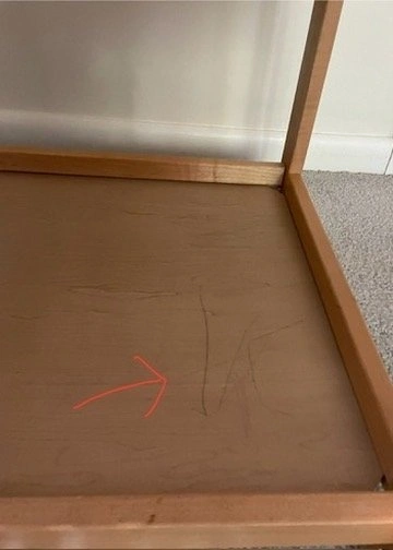 *Second shelf has child's smiley face drawing as shown and imperfections