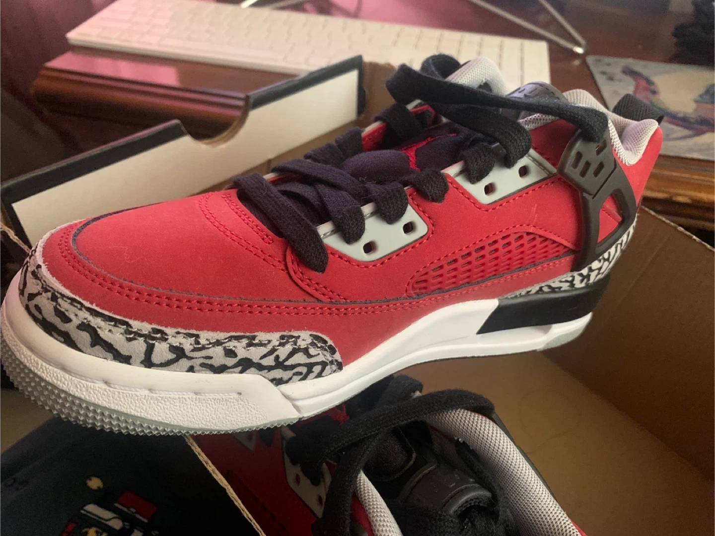 Selling a pair of Jordan Spizike Low (GS) in a vibrant gym red, black, wolf grey colorway! These shoes are in size 4Y and come with the original box. A stylish and comfortable choice for your kiddo!