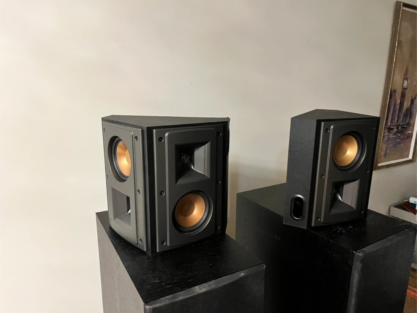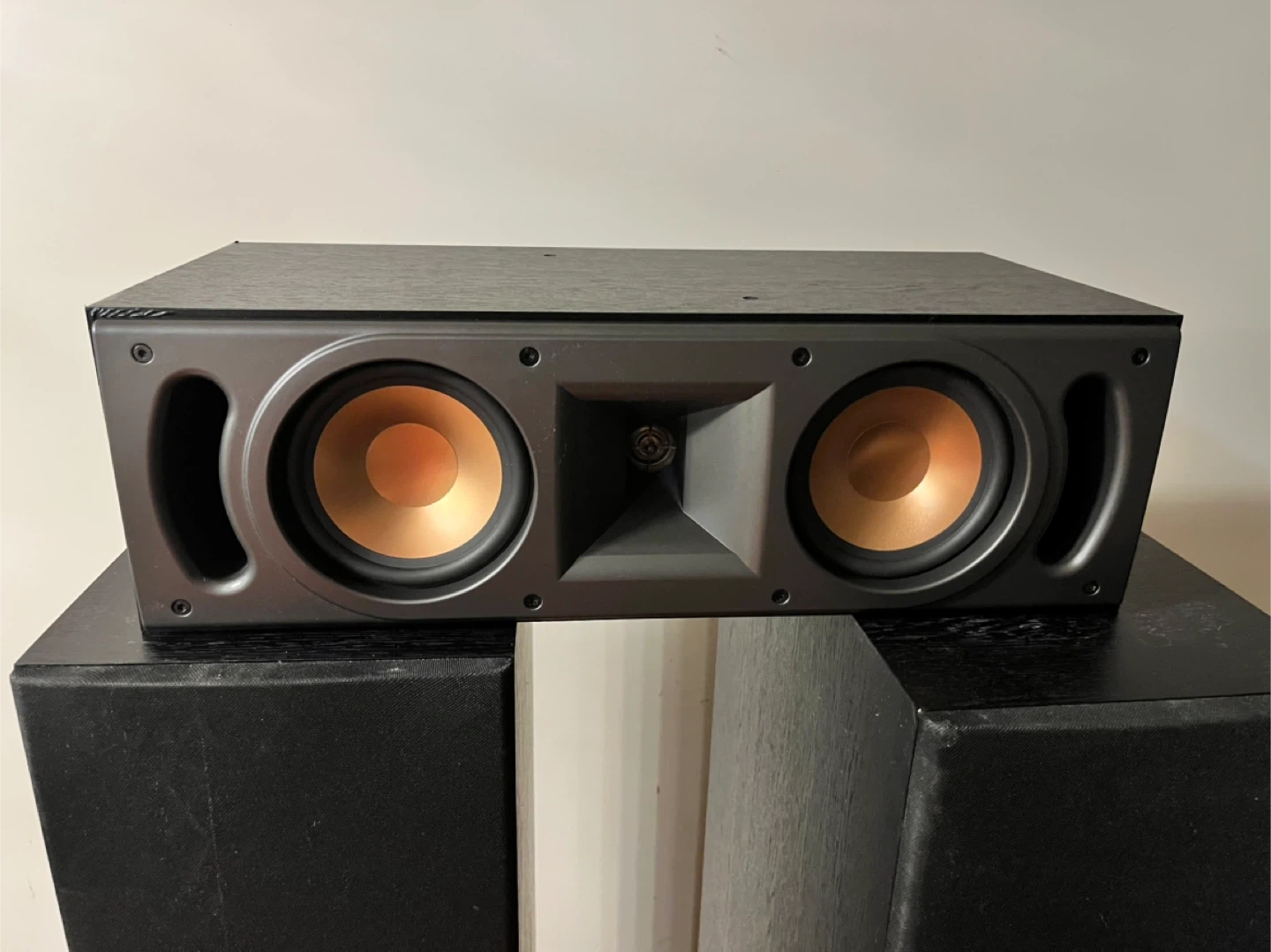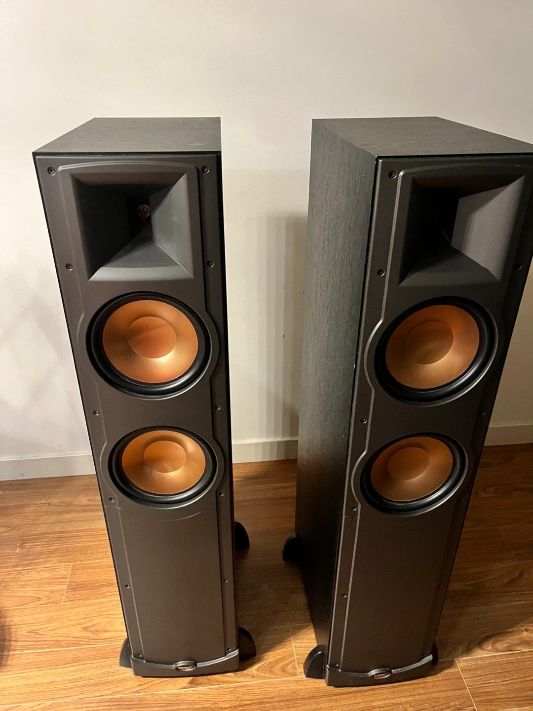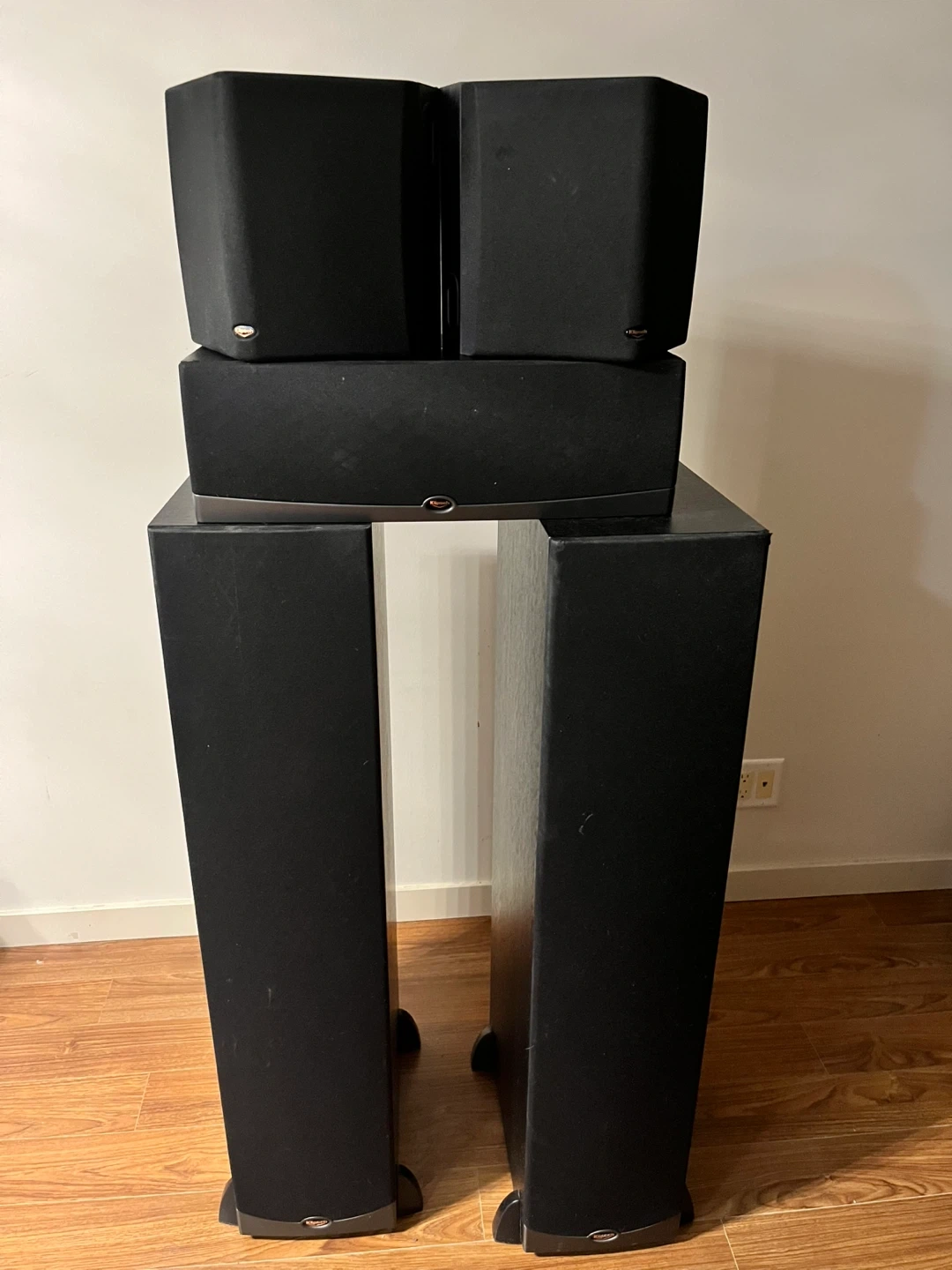 This is a Klipsch 5.1 speaker system with two floorstanding speakers, two bookshelf speakers, one center channel speaker, and a Denon AV receiver. All speakers are black and feature the signature Klipsch copper cone woofers. The system is ready to deliver an immersive audio experience. This bundle is great for setting up a home theatre system.