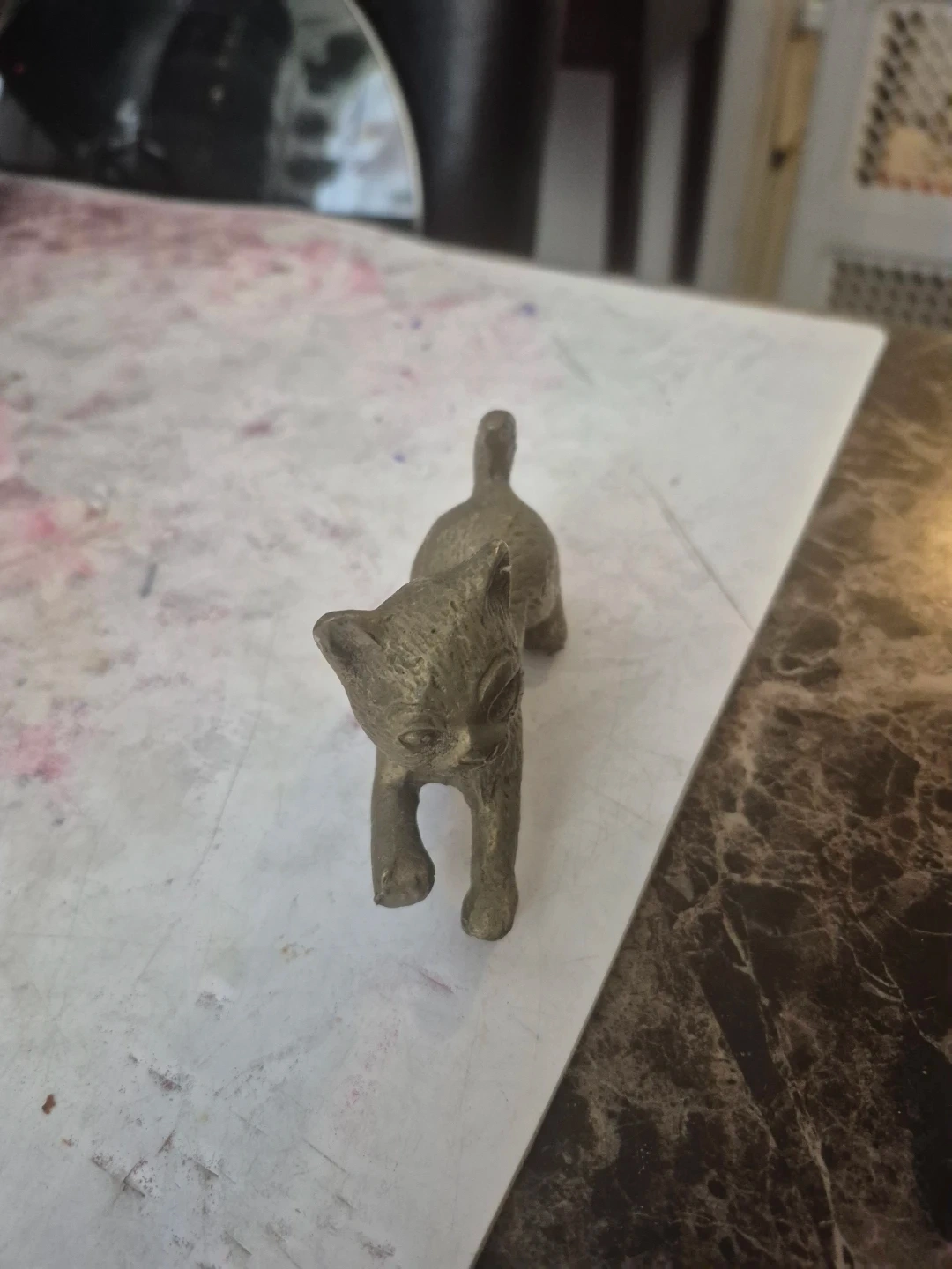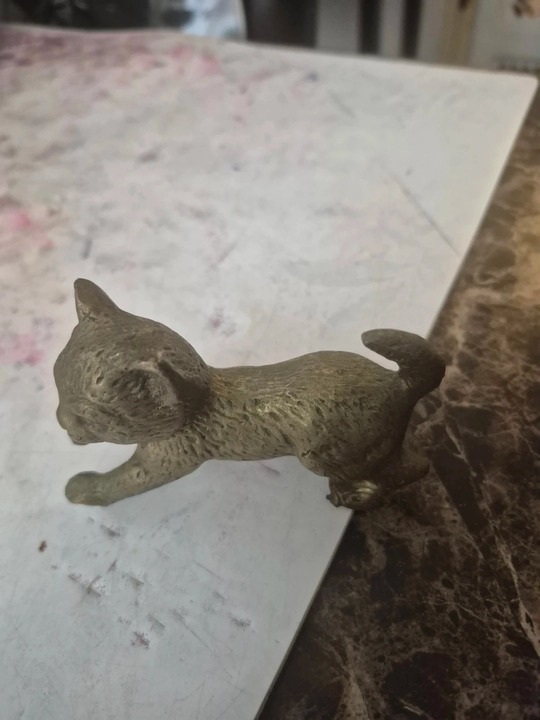 A charming vintage figurine of a kitten, crafted from brass. It's a small, detailed piece that's perfect for display on a shelf or desk. This cute cat adds a touch of whimsy to any space!