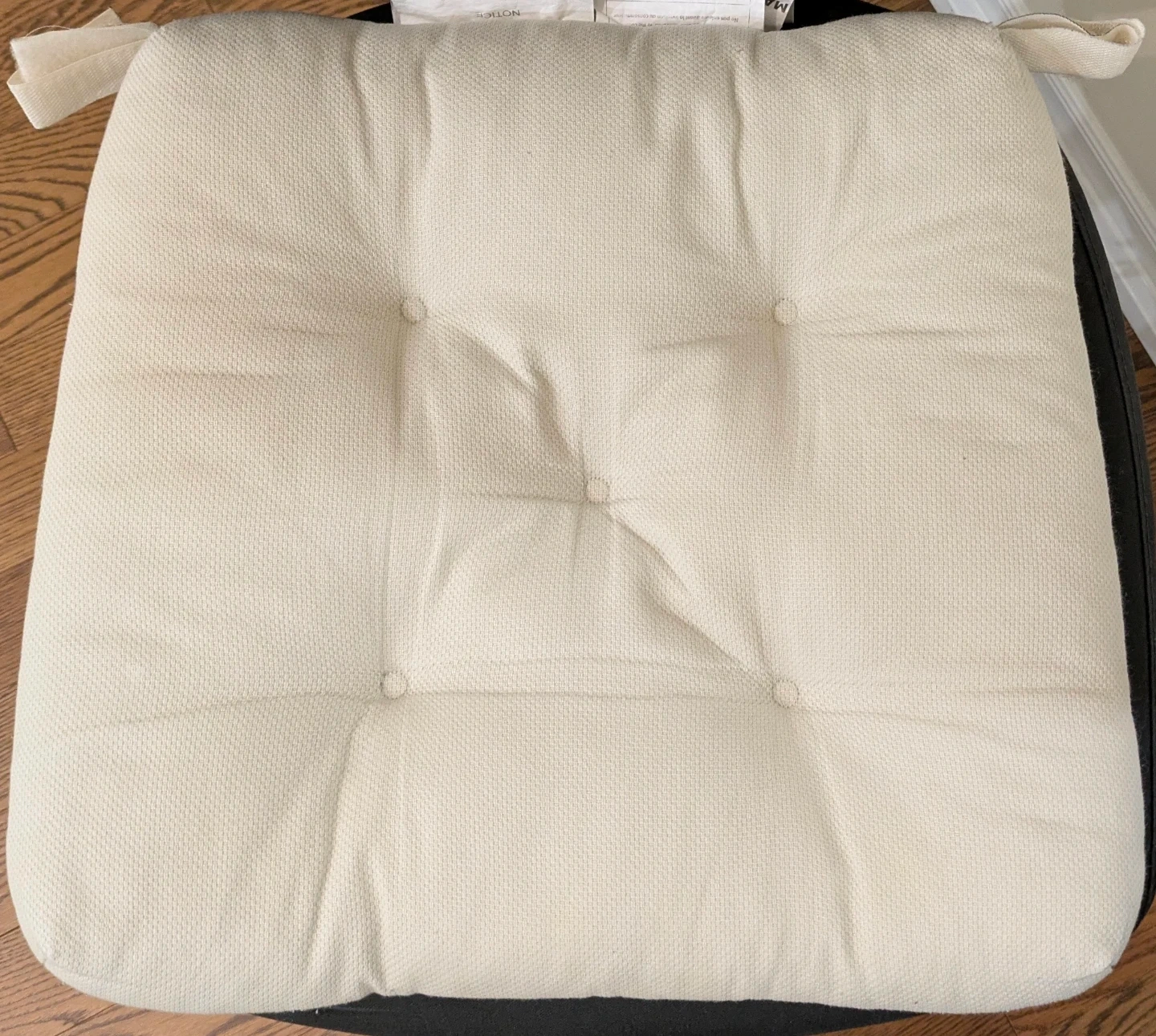 Adds comfort to your seating! It's a light beige seat cushion with fabric ties. The neutral colour makes it versatile.