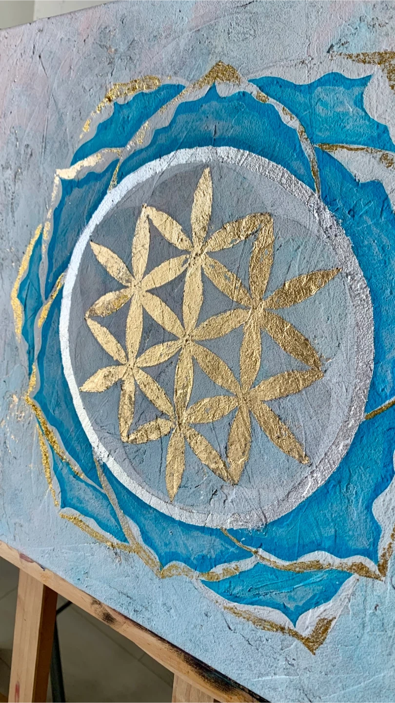 Textured canvas art featuring a blue and gold 'Flower of Life' mandala design. This piece has a serene and spiritual aesthetic. Measures approximately 12x12 inches.