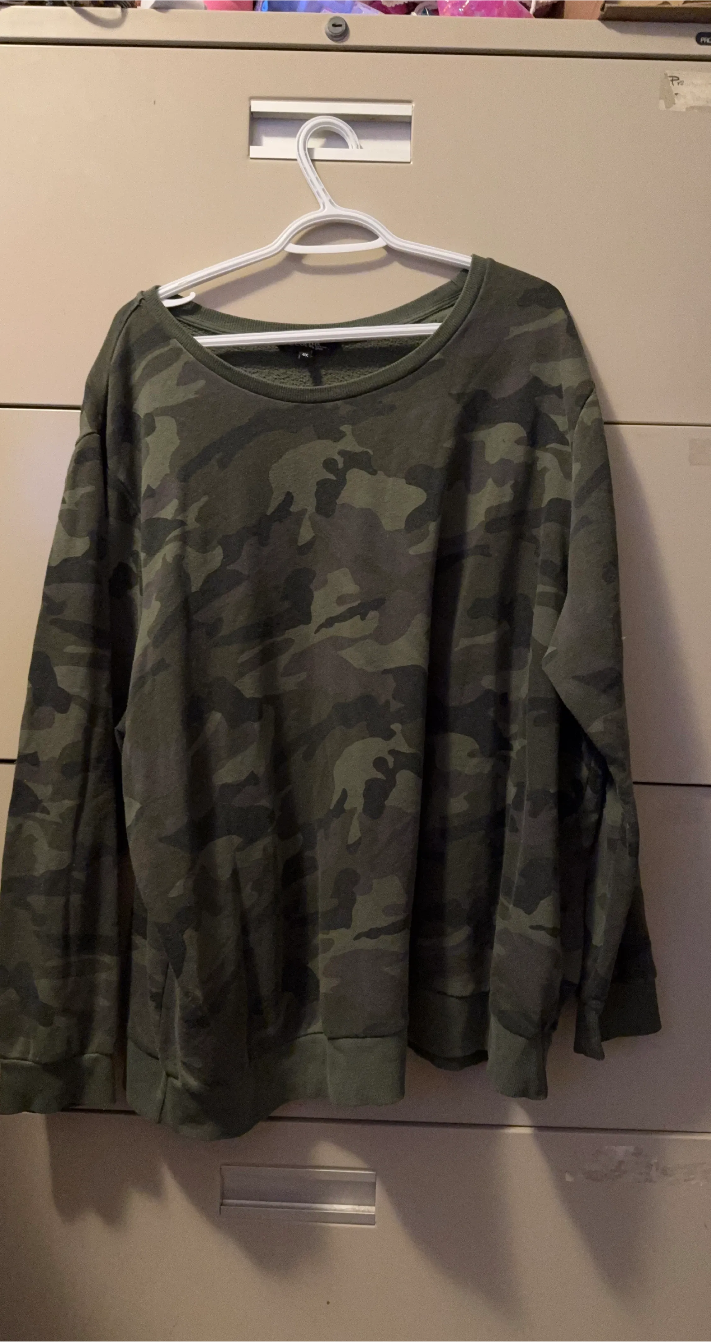 Here's a comfy camo print sweatshirt in a size 4X. It's perfect for casual wear and layering up on cooler days. The material is soft and cozy, making it great for lounging around the house or running errands. It's in great condition and ready for a new home!