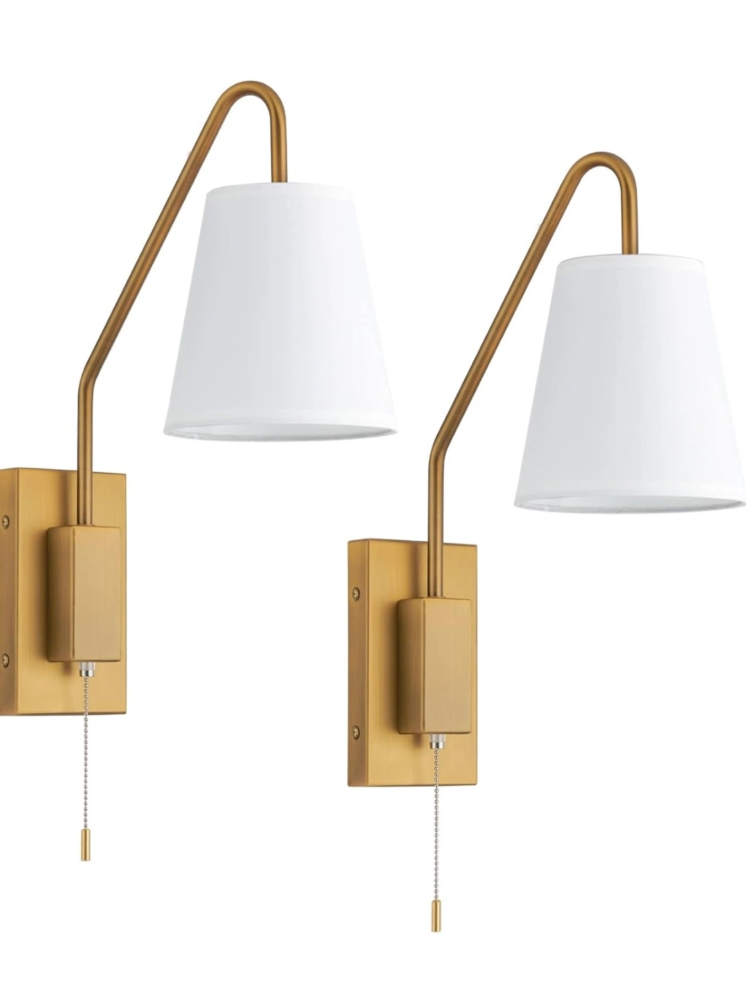 Terleenart Modern Classic Set of 2 Swing Arm Bedside Reading Wall Sconce with Pull Chain On/Off Switch, Antique Brass Metal Wall Light with Sloped Arm and White Fabric Shade