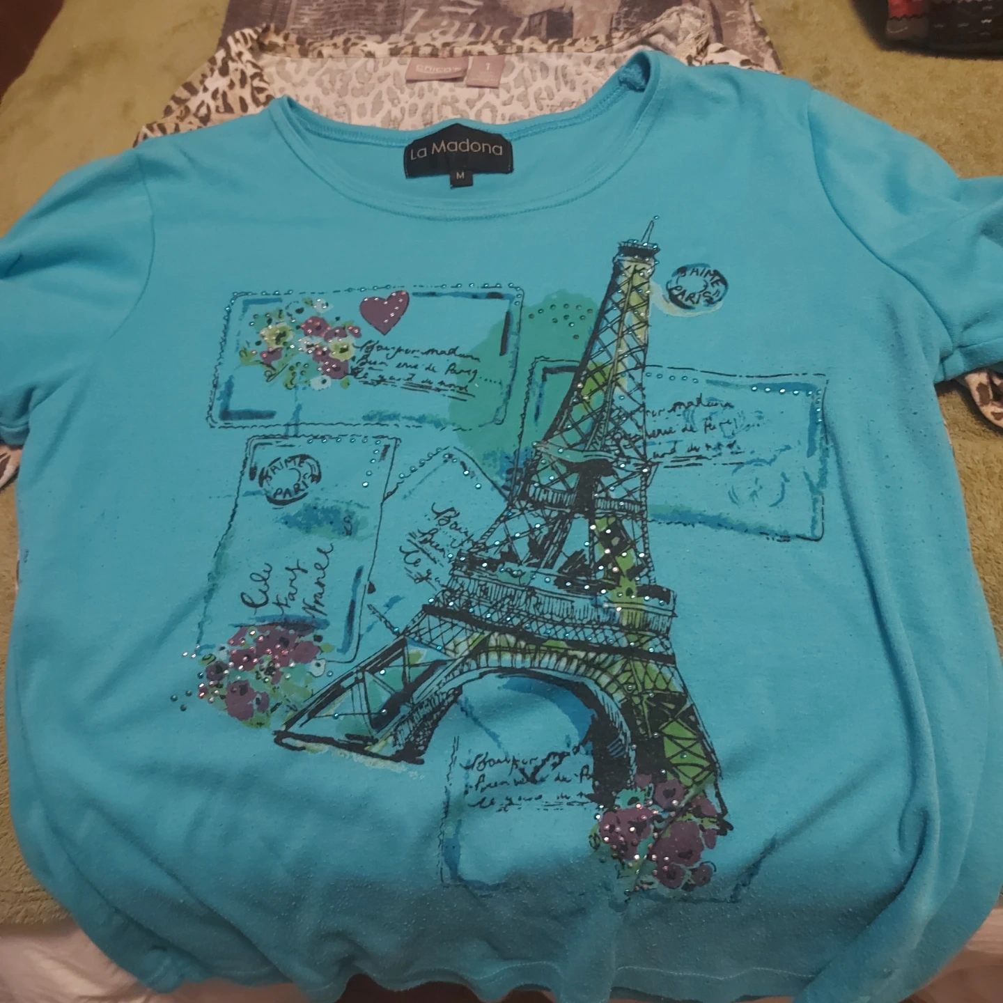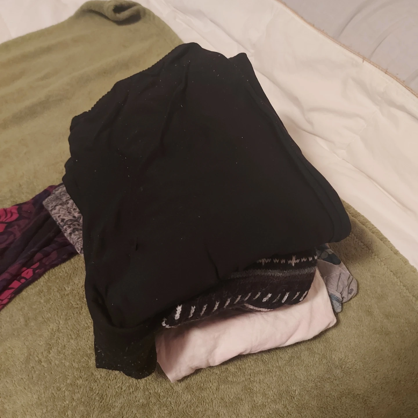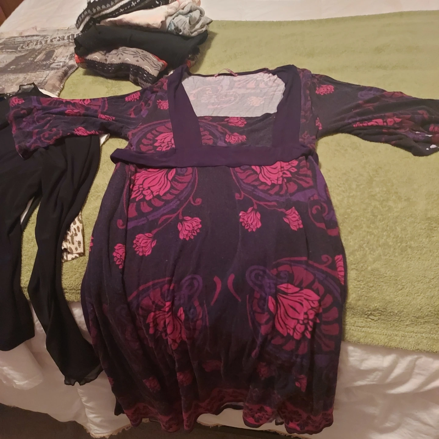 Bundle includes a black long-sleeve sheer top with ruffled neckline, a purple and pink floral print dress, and black leggings. The sheer top has a size tag that reads 'M'. Peach Face cloth, Apple green tea towel.