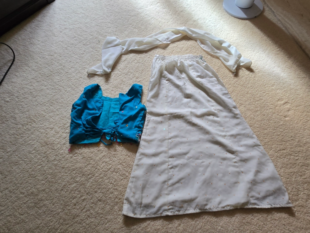 Selling a beautiful Indian outfit! It includes a skirt, blouse, and shawl. The blouse is size 70 cm. The skirt is white with bead work. Perfect for a special occasion!