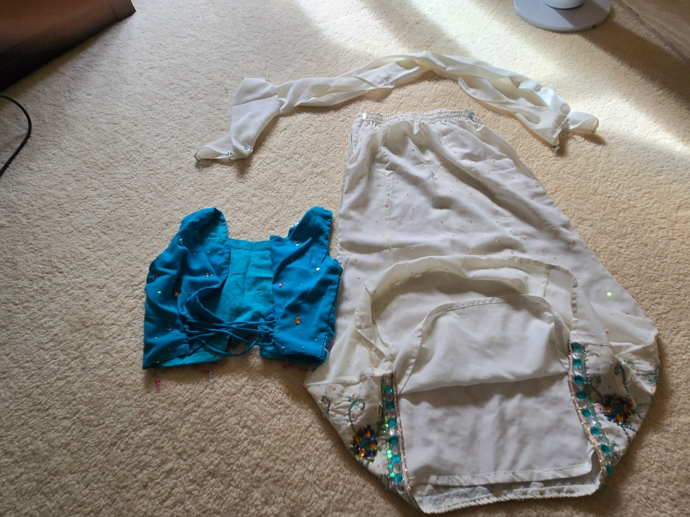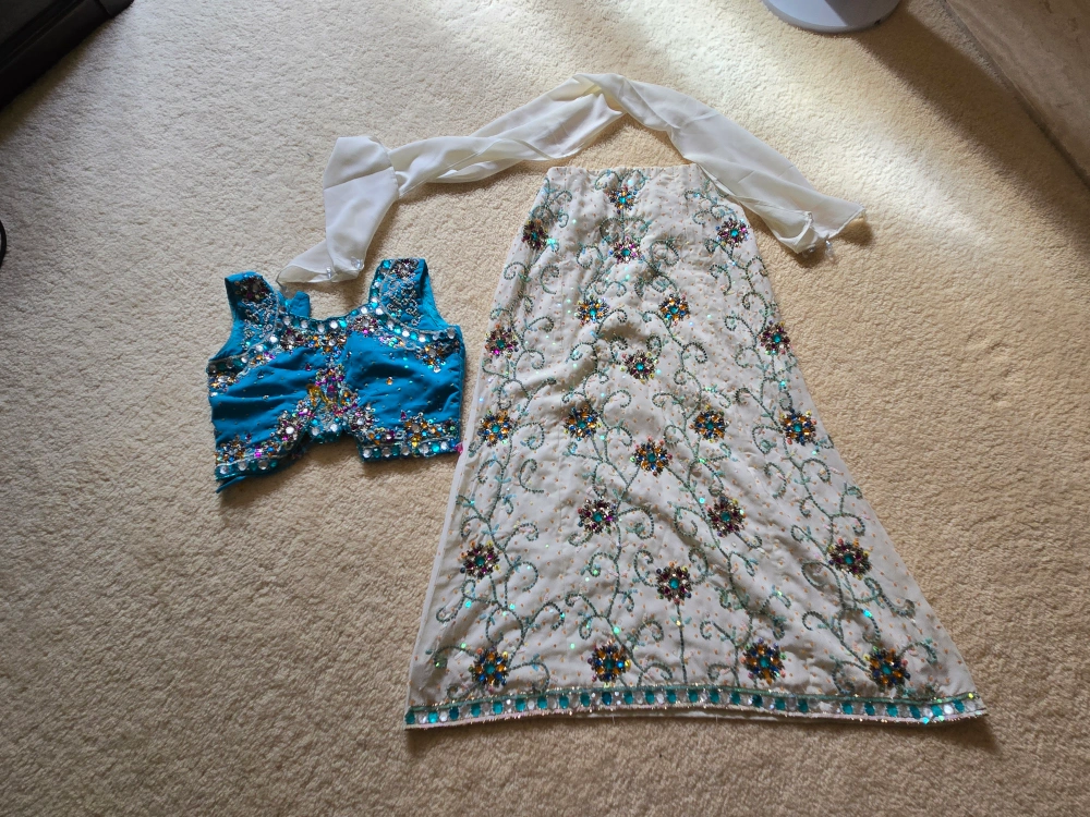 Selling a beautiful Indian outfit! It includes a skirt, blouse, and shawl. The blouse is size 70 cm. The skirt is white with bead work. Perfect for a special occasion!
