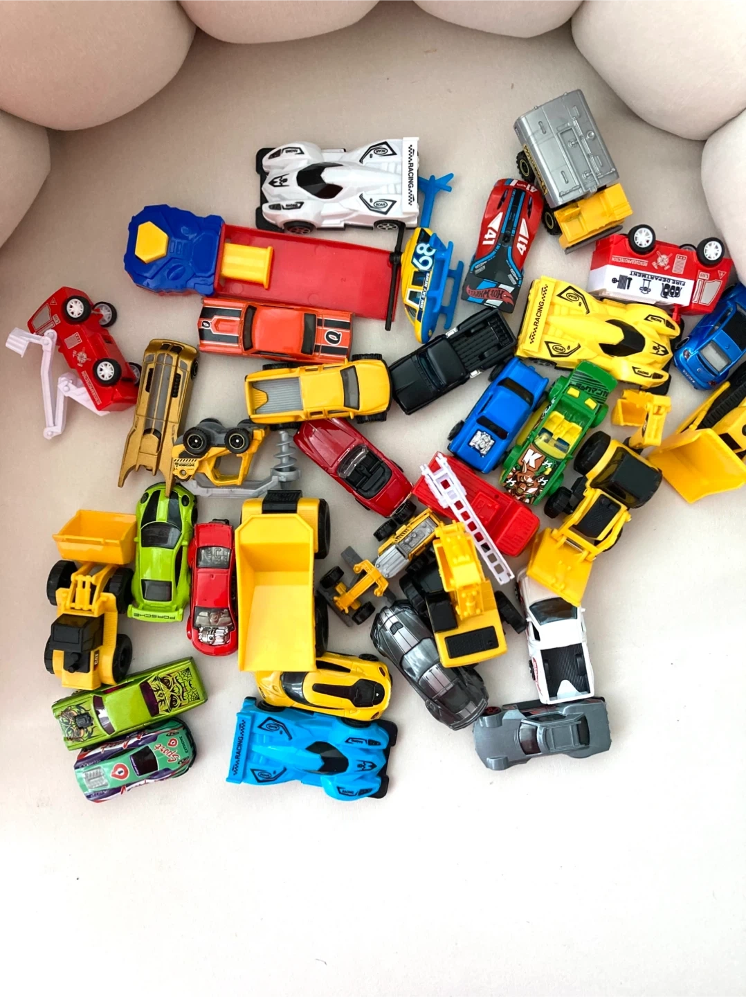 A fun assortment of die-cast toy vehicles, including race cars, trucks, and a helicopter. Perfect for playtime or display. Get ready for some imaginative adventures!