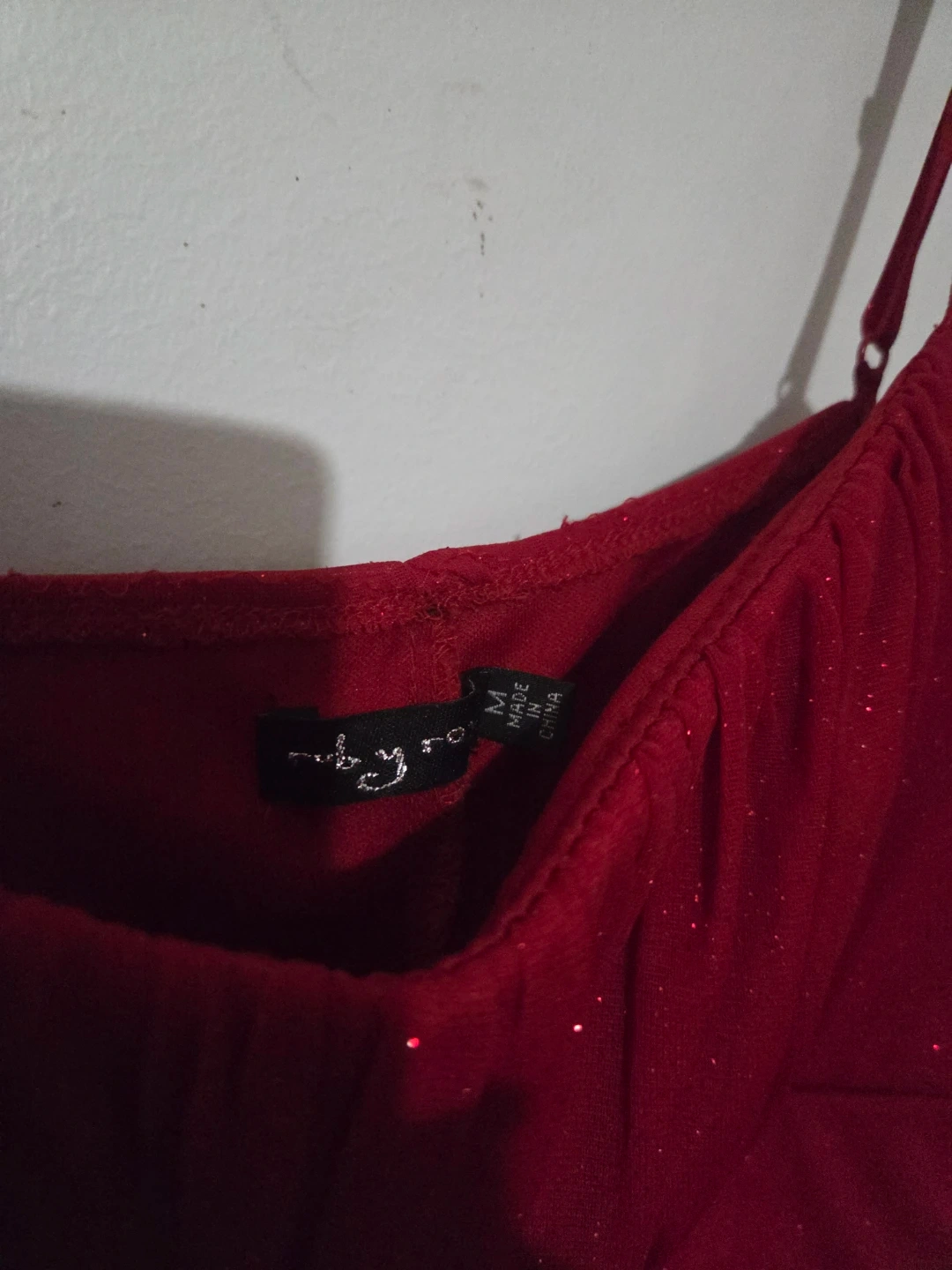 This stunning red dress features a sparkly fabric throughout. It's a size medium with a sweetheart neckline and a decorative jeweled embellishment at the bust. The adjustable spaghetti straps offer a comfortable fit.