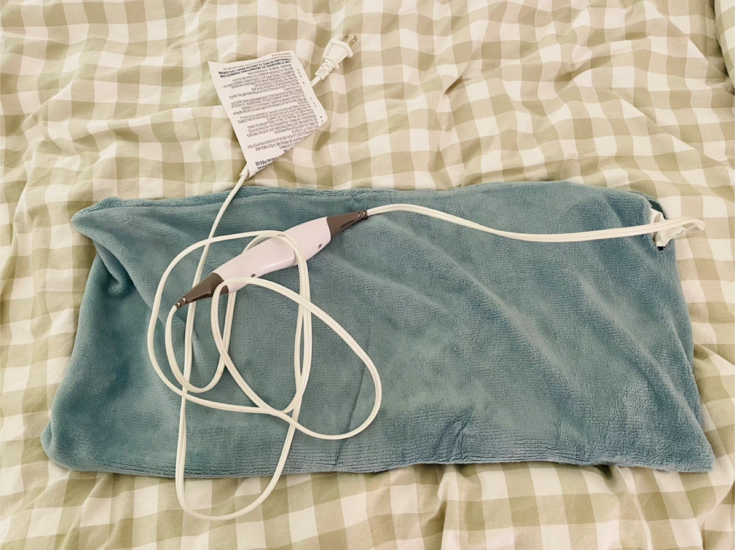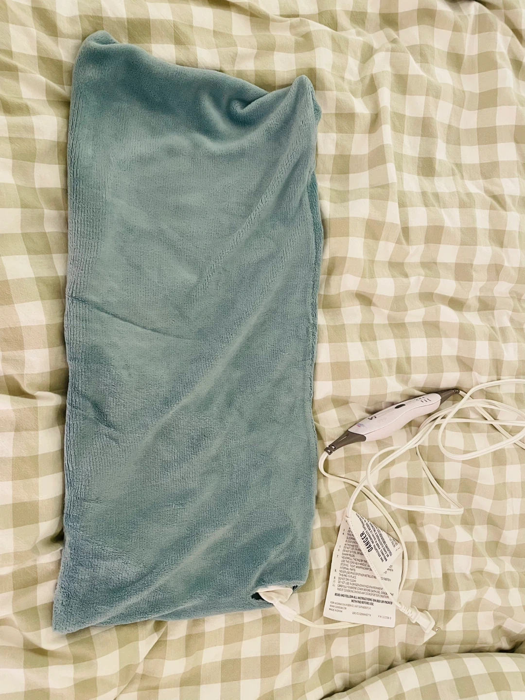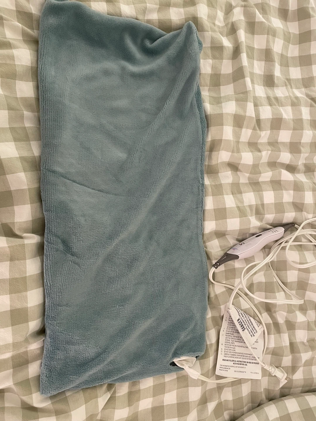 This is a plush heating pad in a soft teal colour. It comes with a power cord and controller. Great for soothing aches and pains!