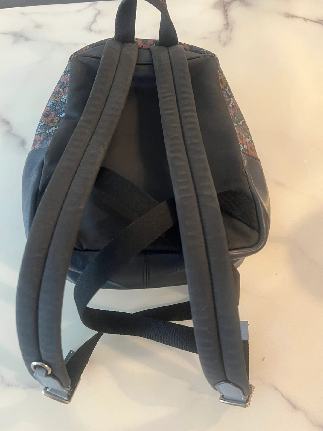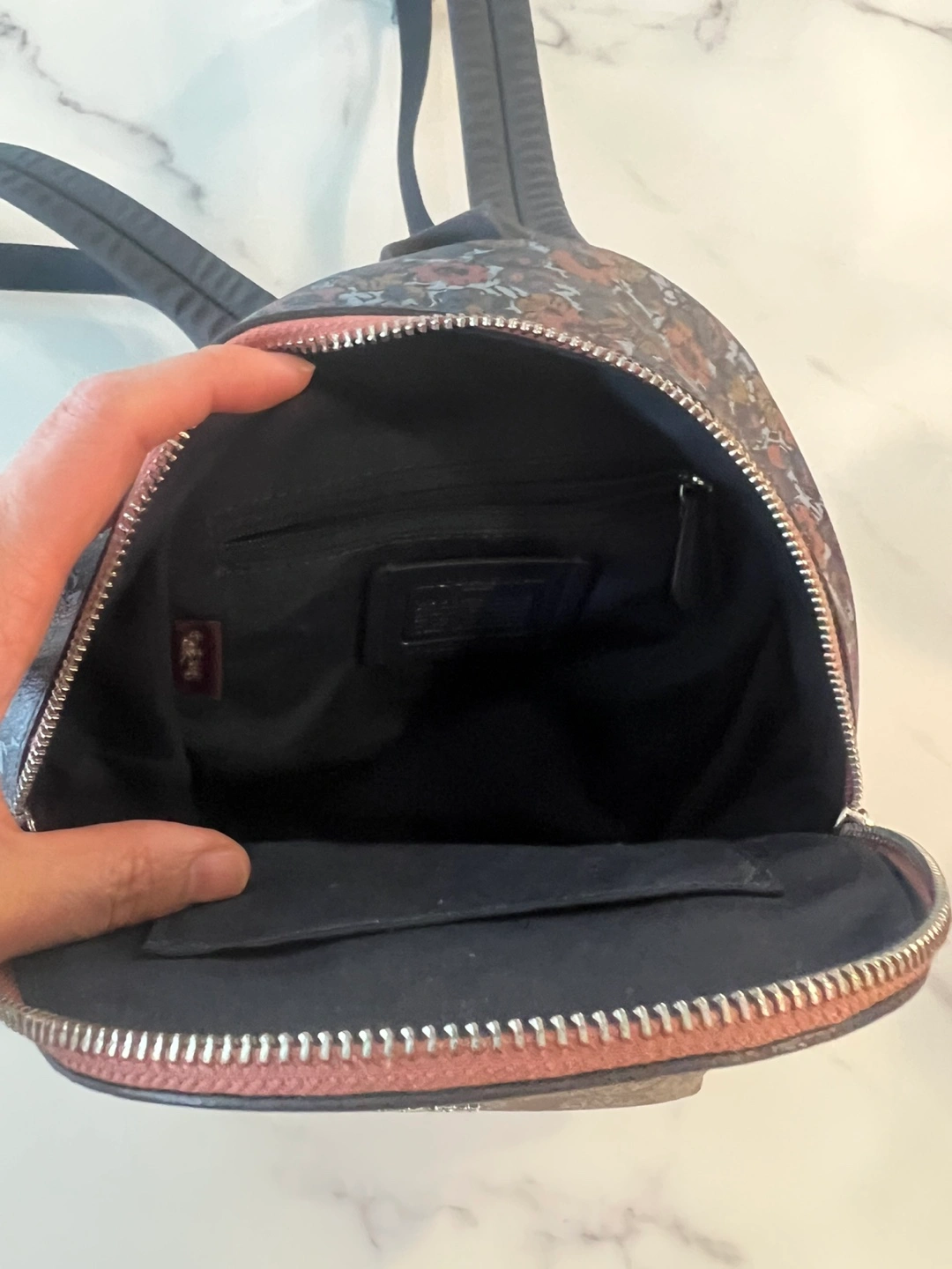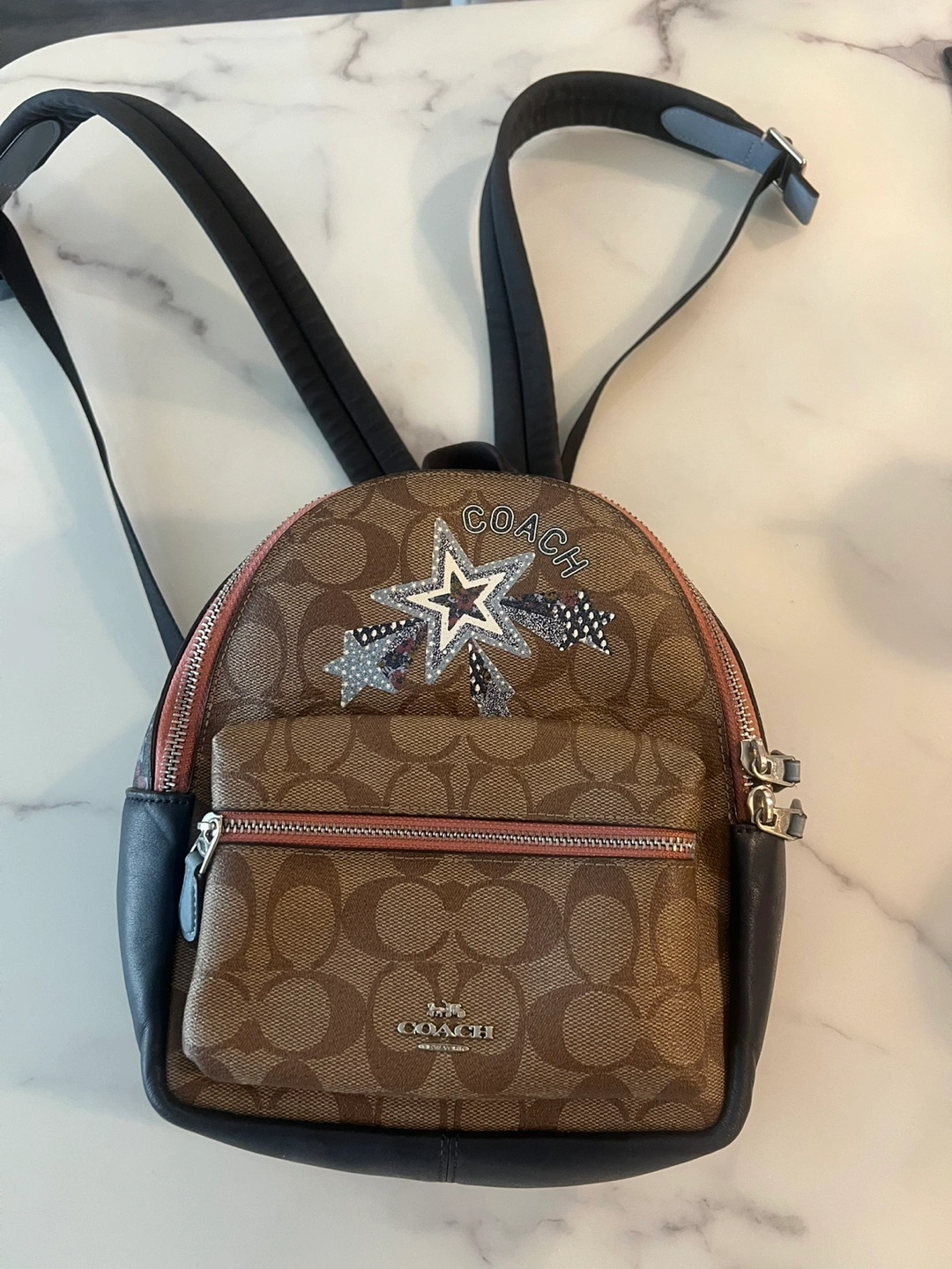 Adorable mini backpack. Features Coach signature canvas with star embellishments. Black leather trim. Adjustable straps. Small interior pocket. Zip closure.