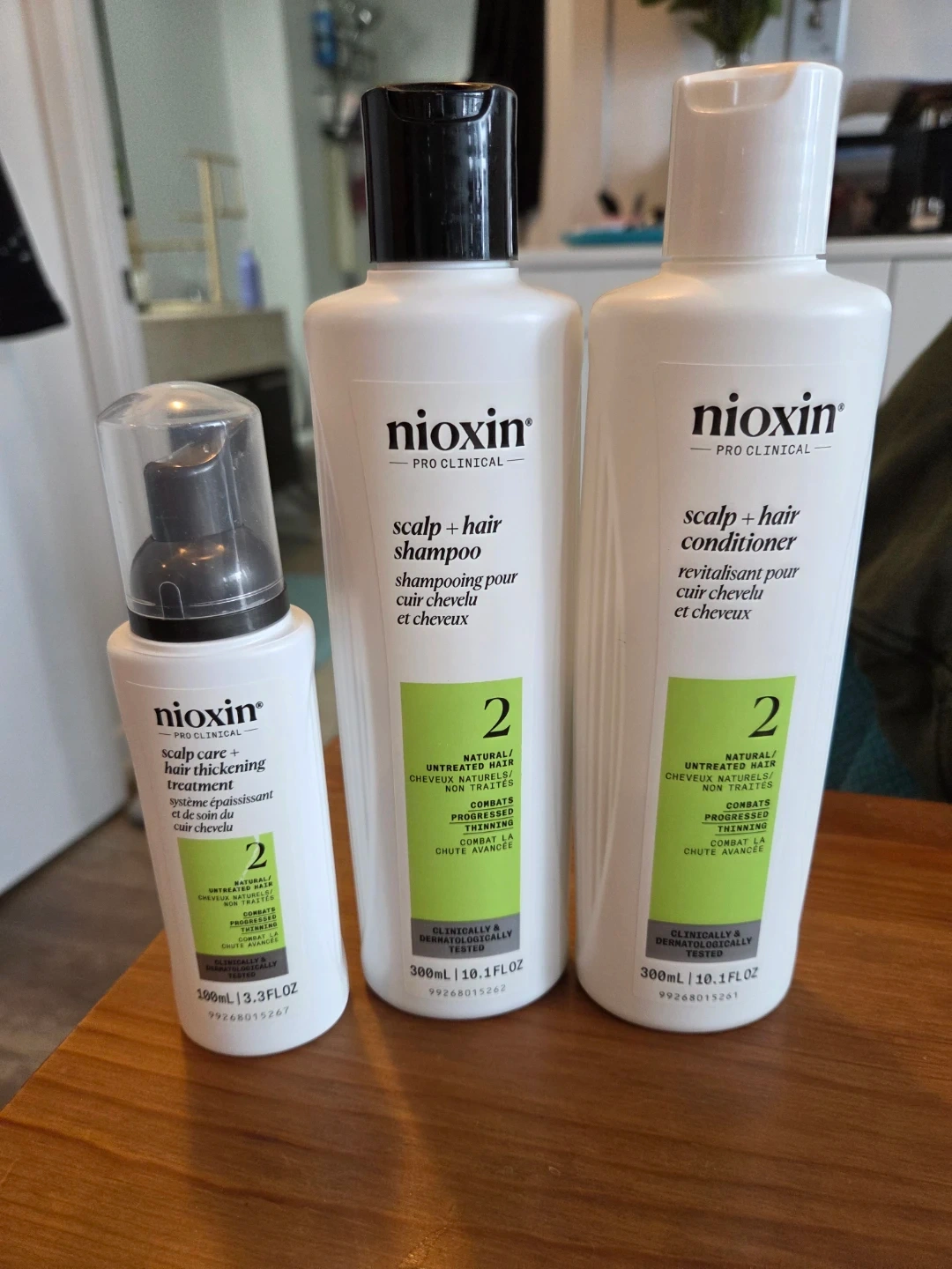 Set includes Nioxin Pro-Clinical Scalp + Hair Shampoo (300mL) and Conditioner (300mL), plus Scalp Care + Hair Thickening Treatment (100mL). All are System 2 for natural/untreated hair with progressed thinning.