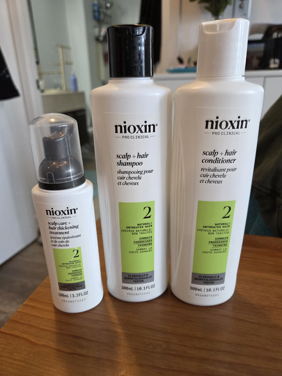 Set includes Nioxin Pro-Clinical Scalp + Hair Shampoo (300mL) and Conditioner (300mL), plus Scalp Care + Hair Thickening Treatment (100mL). All are System 2 for natural/untreated hair with progressed thinning.